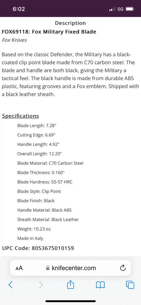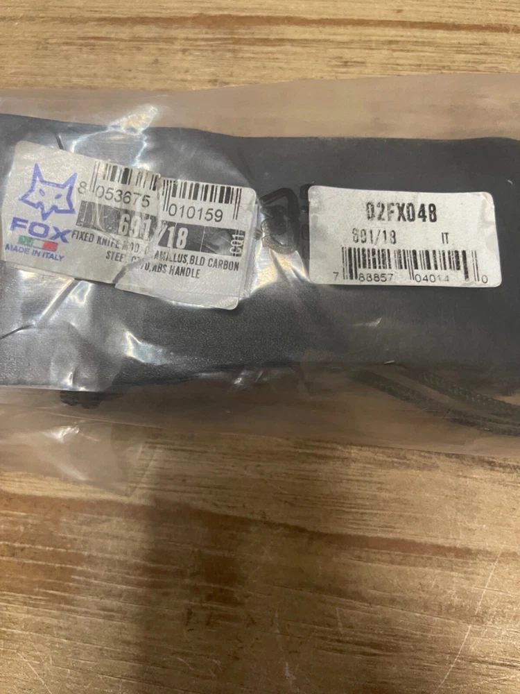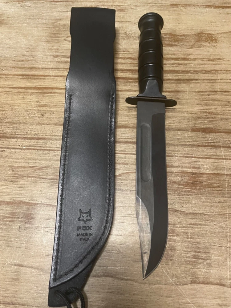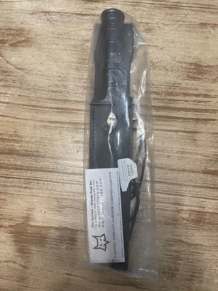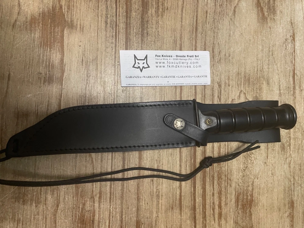Fox Tactical Knives of Italy Fixed Blade Combat Knife, new in original shipping bag. This is a ‘Ka-Bar style’ fighting knife that features a 7.28” clip point blade made out of C-70 High Carbon Italian Steel. The handle is made of high strength, impact resistant ABS Polymer and is grooved for texture/ grip. This knife comes with a high quality leather sheath as well. Very robust knife. Model # 02-FX048. This would be an excellent knife for military deployment, self defense or as a great addition to a ‘bug out bag’.