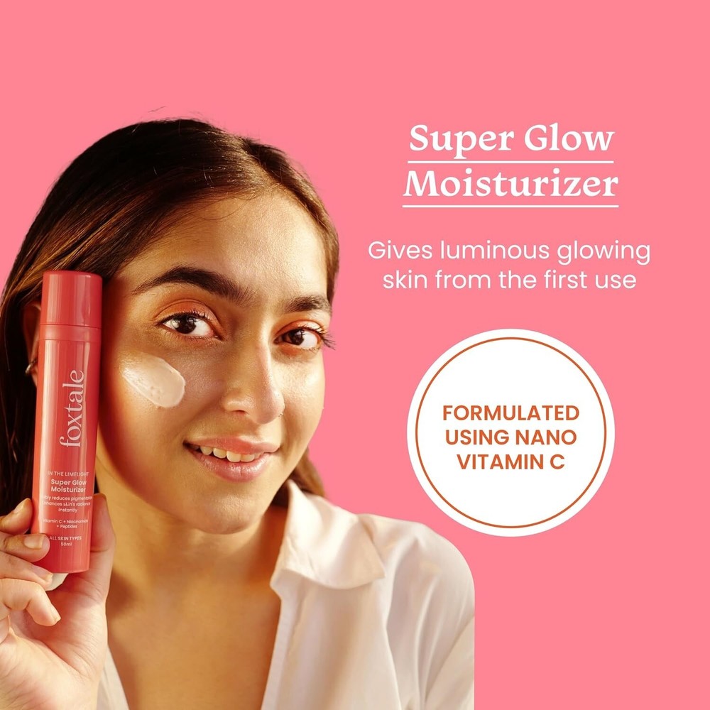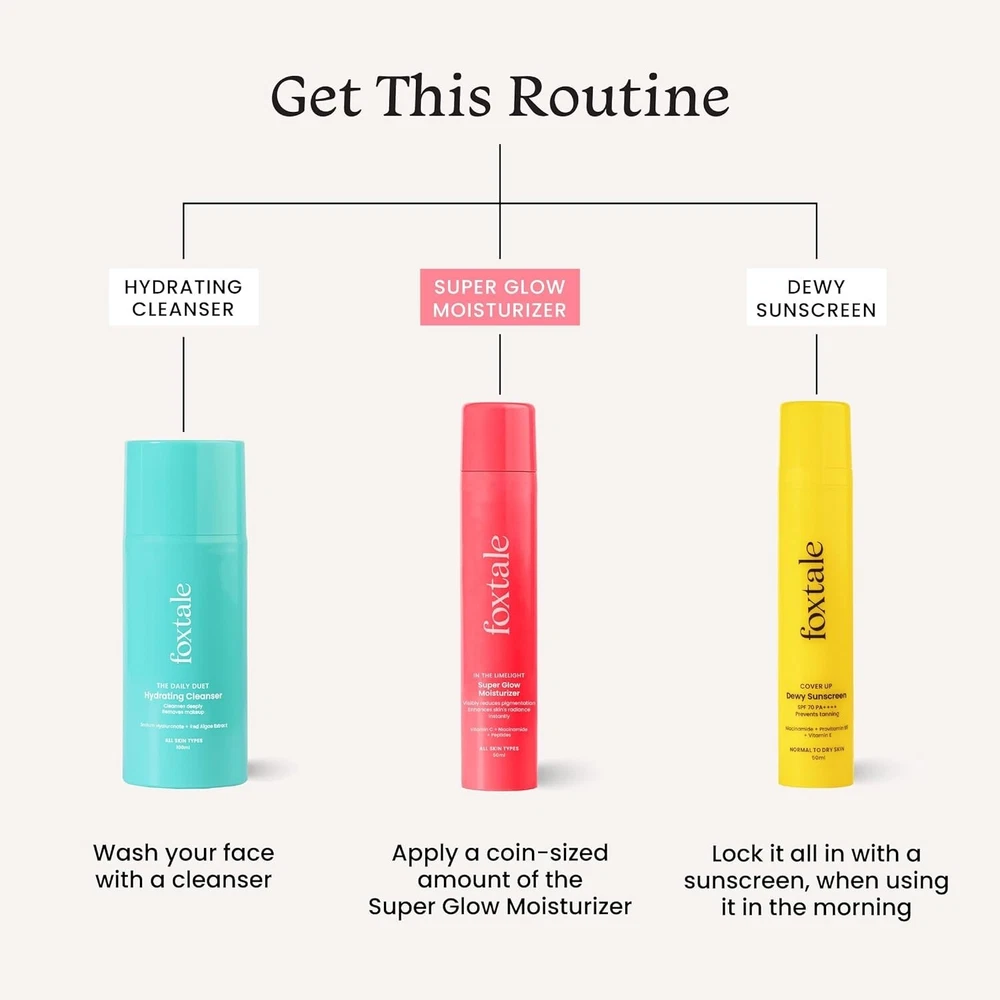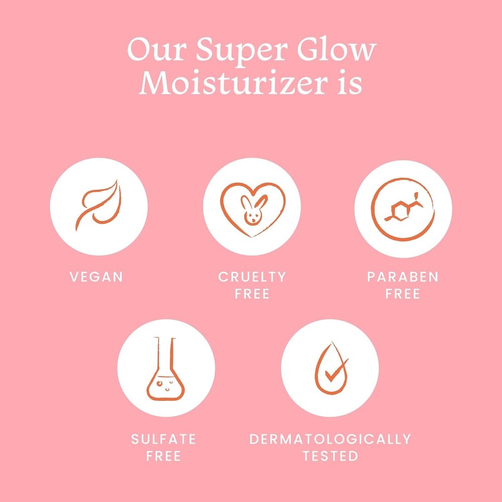 Ingredients: Aqua, Propylene Glycol, Dicaprylyl Carbonate, Caprylyl Methicone, Ceteary! Alcohol, Cetearyl Glucoside, Ethyl Ascorbic Acid, Diethylamino Hydroxybenzoyl Hexyl Benzoate, Cyclopentasiloxane, Dimethicone, Glyceryl Monostearate, Ammonium Acryloyldimethyltaurate/VP Copolymer, Niacinamide, Squalane, Tocopherol, xyethanol, Ethylhexylglycerin, Octenidine HCI, Titanium Dioxide, Mica, Tin Oxide, Synthetic Fluorphlogopite, Silica, Ascorbyl Palmitate, Euterpe Oleraceae Fruit Oil, Rubus ldaeus Seed Oil, Oligopeptide-68, Butylene Glycol, Hydrogenated Lecithin, Sodium Oleate, Disodium EDTA, Citric Acid, Simethicone, Allergen Free Fragrance, CI 16255 Directions: "Step 1: Wash your face with a cleanser Step 2: Apply a coin-sized amount of the Super Glow Moisturizer Step 3: Lock it all in with a sunscreen "