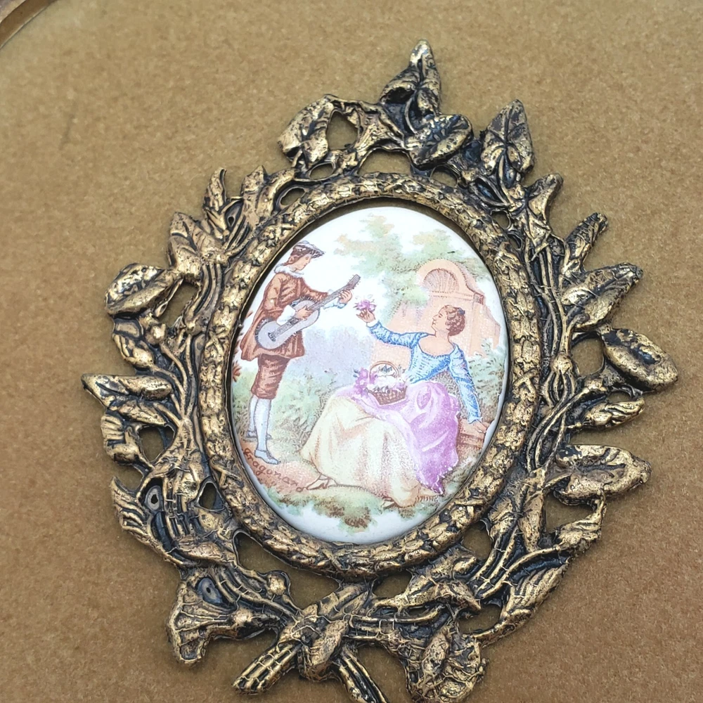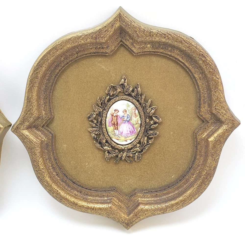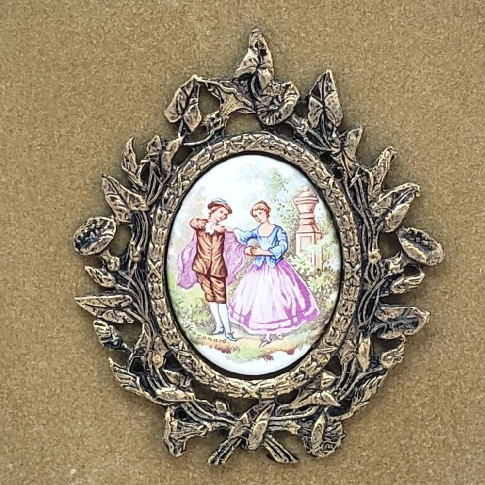 Vintage Porcelain Courting Couple Framed Medallion On Velvet. Lot of 2 both included Porcelain fragonard signed Courting Couple Medallions surrounded by ivy and floral setting. Backing is a light brown velvet and a gold tone plastic frame. Ready to be placed on a wall both are in very good condition with a couple of light scratches to the velvet. Porcelain Medallions measure 2" x 1 1/2" Overall measurements of frame is 9" x 9"