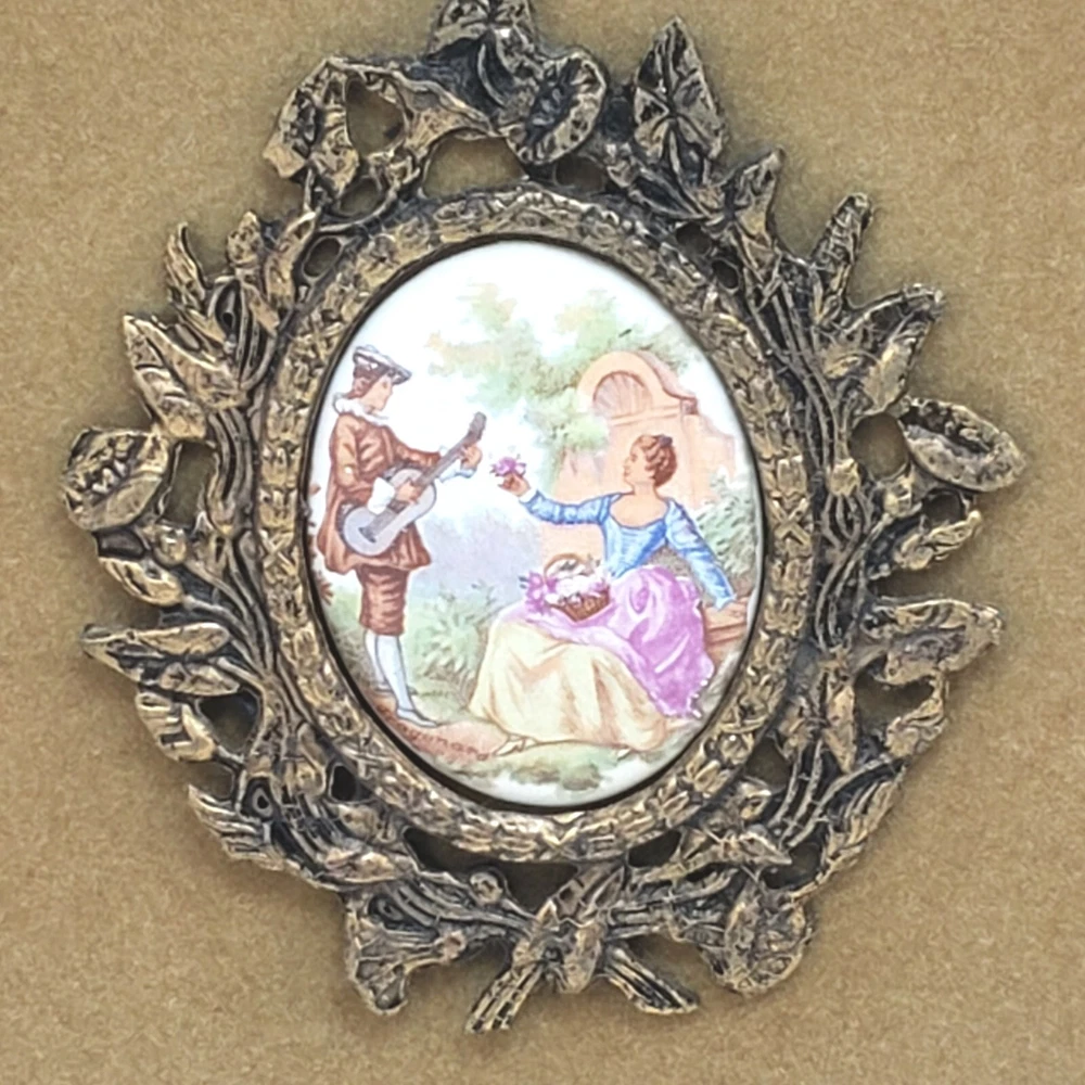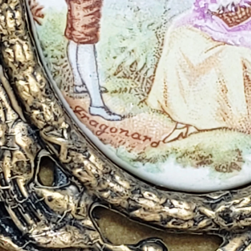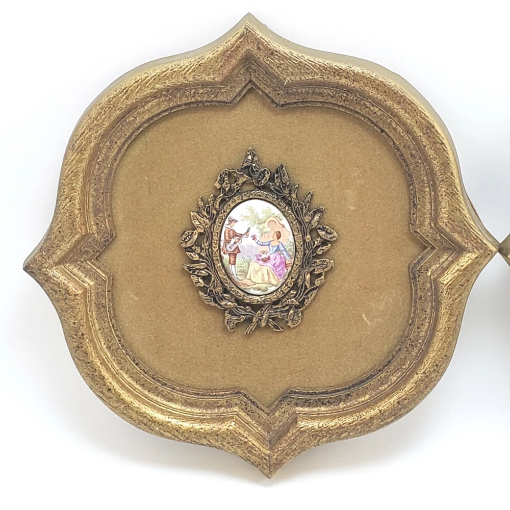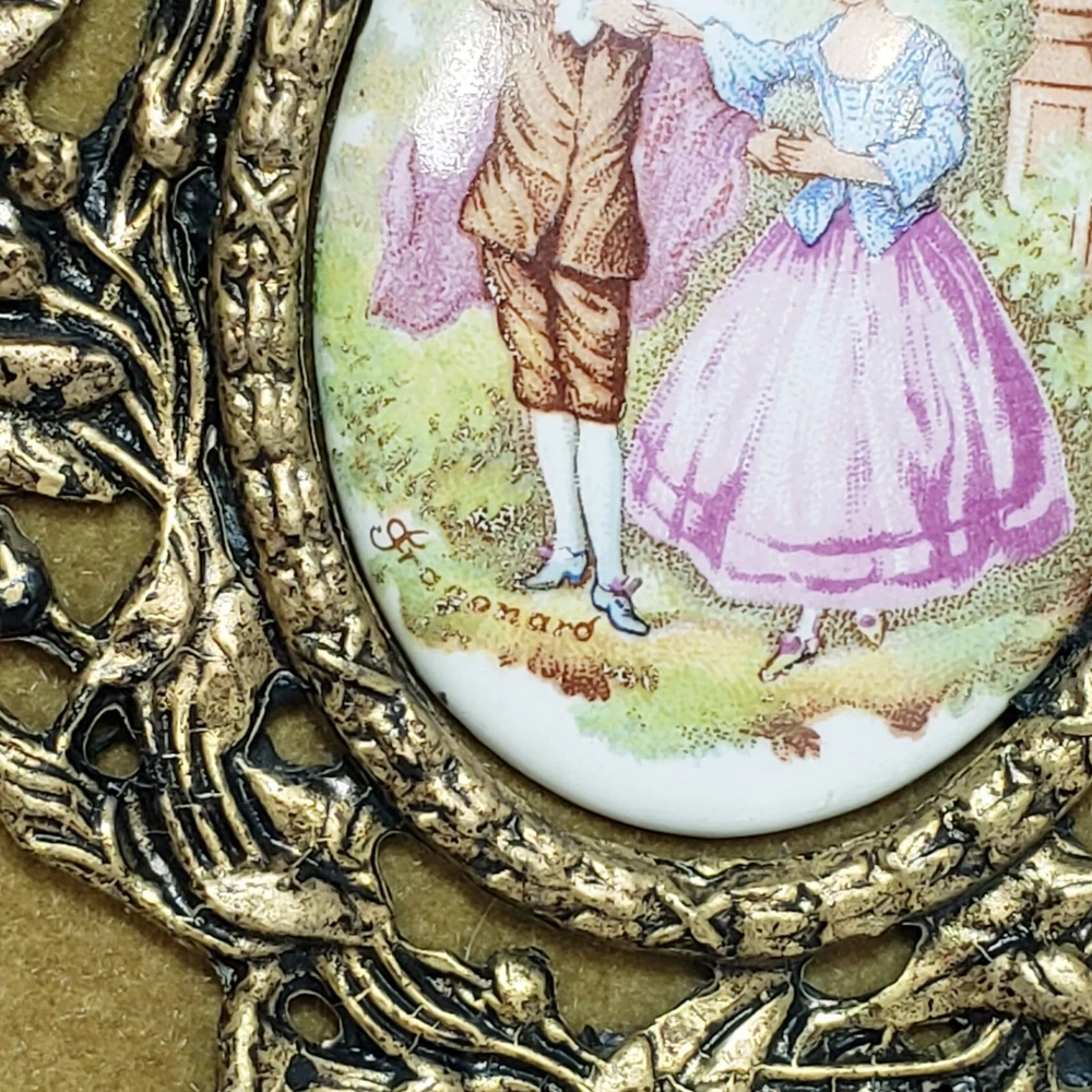 Vintage Porcelain Courting Couple Framed Medallion On Velvet. Lot of 2 both included Porcelain fragonard signed Courting Couple Medallions surrounded by ivy and floral setting. Backing is a light brown velvet and a gold tone plastic frame. Ready to be placed on a wall both are in very good condition with a couple of light scratches to the velvet. Porcelain Medallions measure 2" x 1 1/2" Overall measurements of frame is 9" x 9"