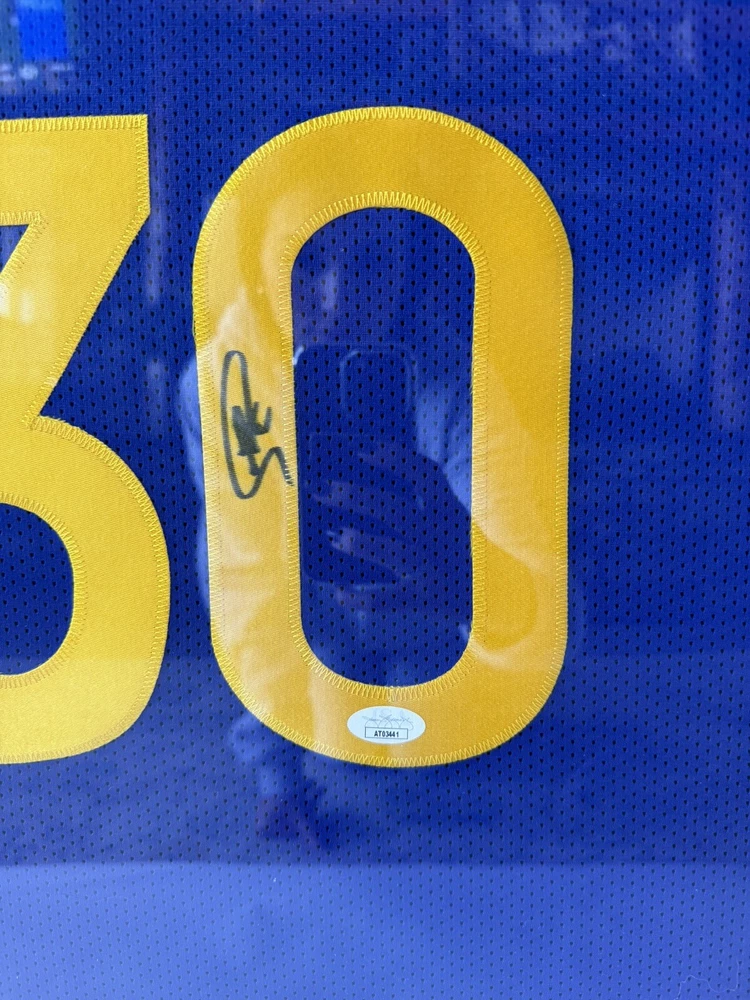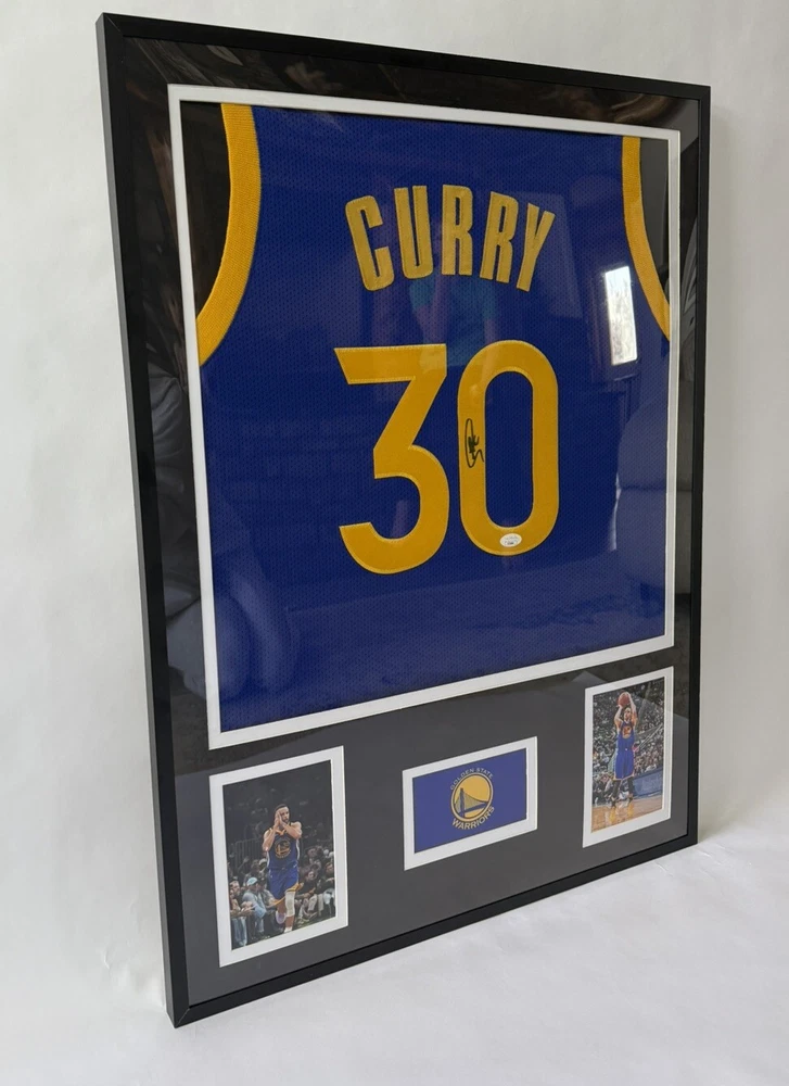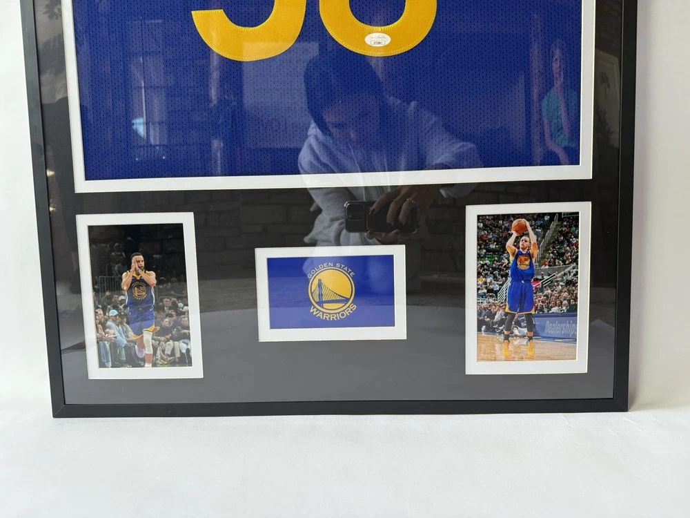 This framed autographed Golden State Warriors jersey is a must-have for any Stephen Curry fan. The jersey is an original, and has been signed by the NBA player himself. It has been authenticated by James Spence Authentication (JSA), ensuring its authenticity. The jersey is perfect for display in your home or office, and is a great addition to any sports memorabilia collection. The autograph authentication provided by JSA adds value to this product, making it a reliable and desirable item for any basketball fan. The size of the frame is 32” x 24”.