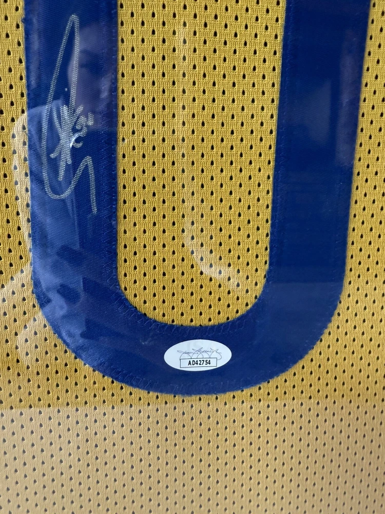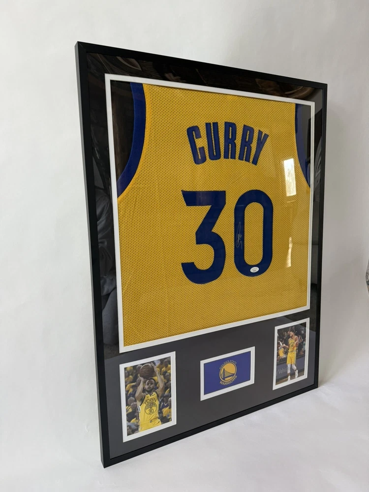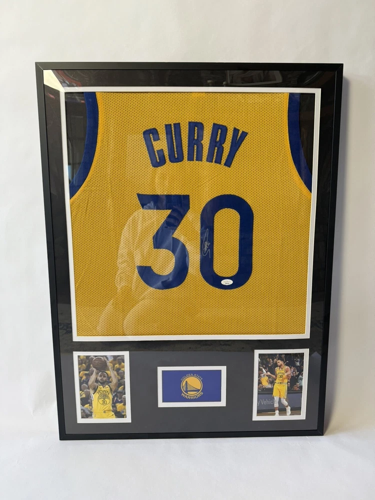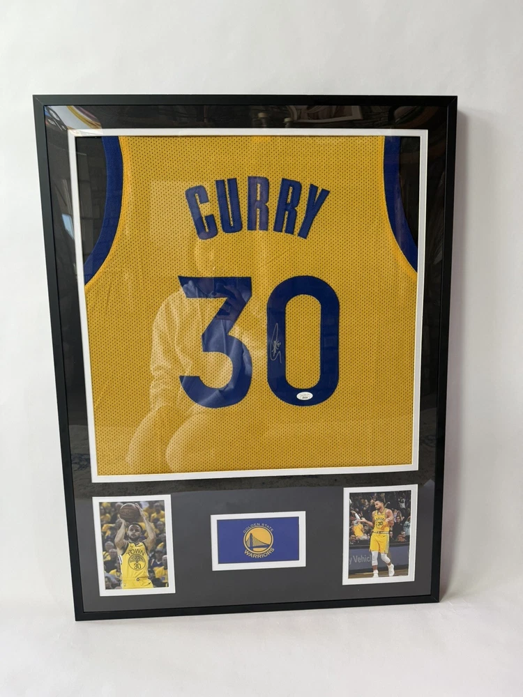 This framed autographed Golden State Warriors jersey is a must-have for any Stephen Curry fan. The jersey is an original, and has been signed by the NBA player himself. It has been authenticated by James Spence Authentication (JSA), ensuring its authenticity. The jersey is perfect for display in your home or office, and is a great addition to any sports memorabilia collection. The autograph authentication provided by JSA adds value to this product, making it a reliable and desirable item for any basketball fan. The size of the frame is 32” x 24”.