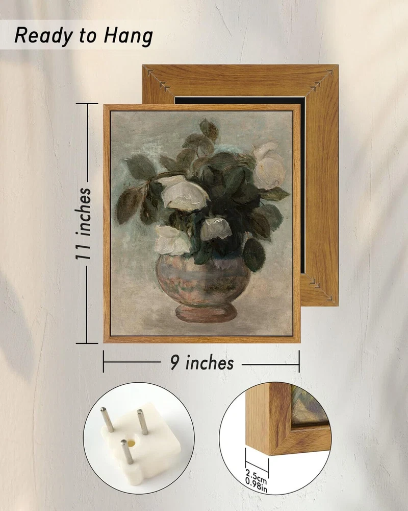 Framed Vintage Botanical Wall Art for Living Room, Rose Flower Pictures Wall Decor, Wall Decorations for Living Room, Bathroom Decor Wall Art 9x11in Classical Wall Art Decor : This vintage floral painting transports us to a bygone era, capturing the essence of a romantic and nostalgic time, allowing us to savor the enduring beauty of flowers through the eyes of talented artists. Premium Quality : This classical oil painting is printed on canvas and wrapped on wood fiberboard, finished with clear medium to keep it waterproof and the color vibrant and long-lasting. Provide a great room decor for your living room, bedroom, bathroom, home bar, office, kitchen, dining room, etc. Ready To Hang : Measuring 9x11in, this framed canvas art wall decor is designed for convenience. It comes with hooks, making it effortless to hang. Before nailing the hook onto your wall, please refer to the installation instruction image provided. Please note that this item is handmade, so a size error of about 0.2 inches may occur. Well Package : We take extra care to ensure your painting arrives in pristine condition. The four corners of the frame are covered with cardboard to stop collisions during transportation, and the outer layer is wrapped with clear film for added firmness. Wonderful Gifts : Whether it's for housewarmings, birthdays, anniversaries, weddings, Christmas, or any other occasion, this rustic home decor makes a thoughtful and impressive gift. Choose from a variety of theme designs and sizes to match your unique room aesthetic and space requirements.