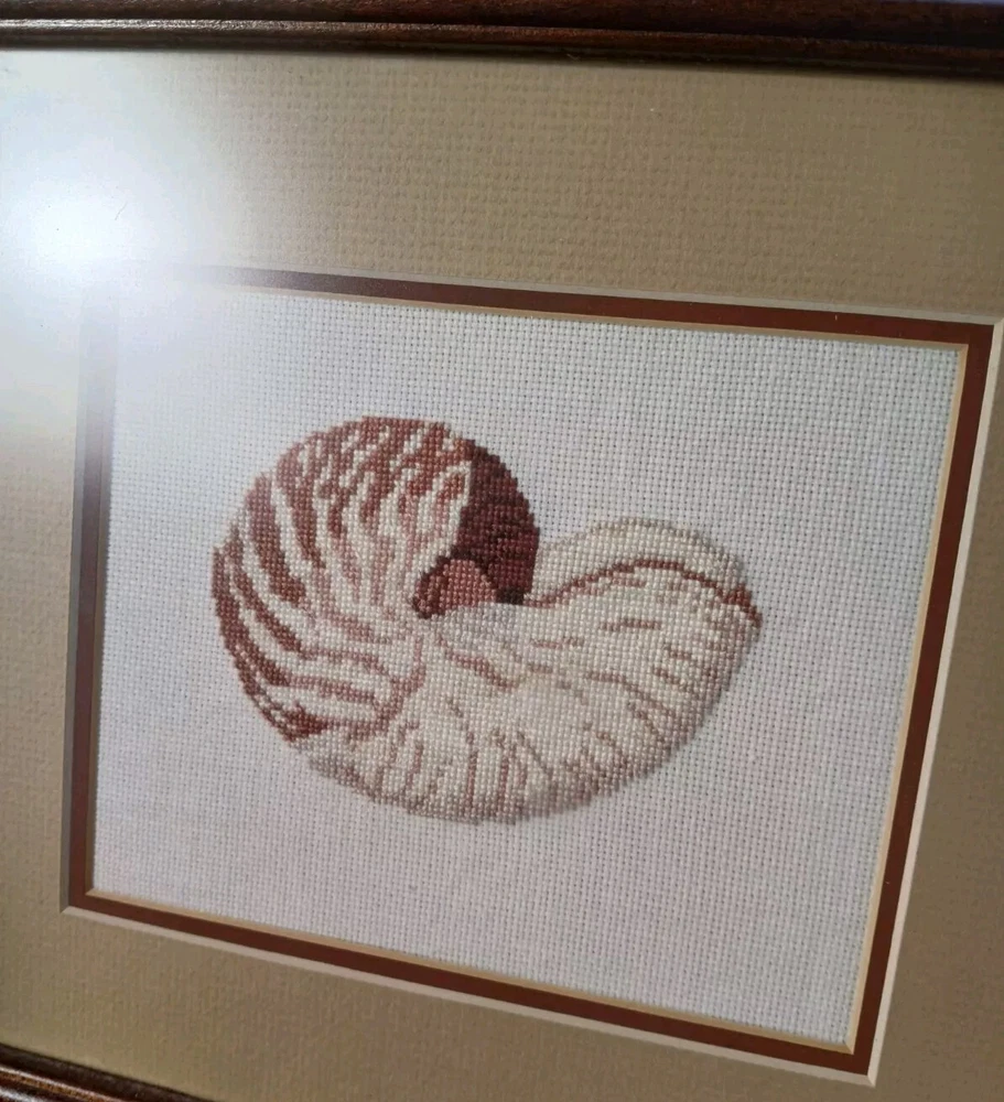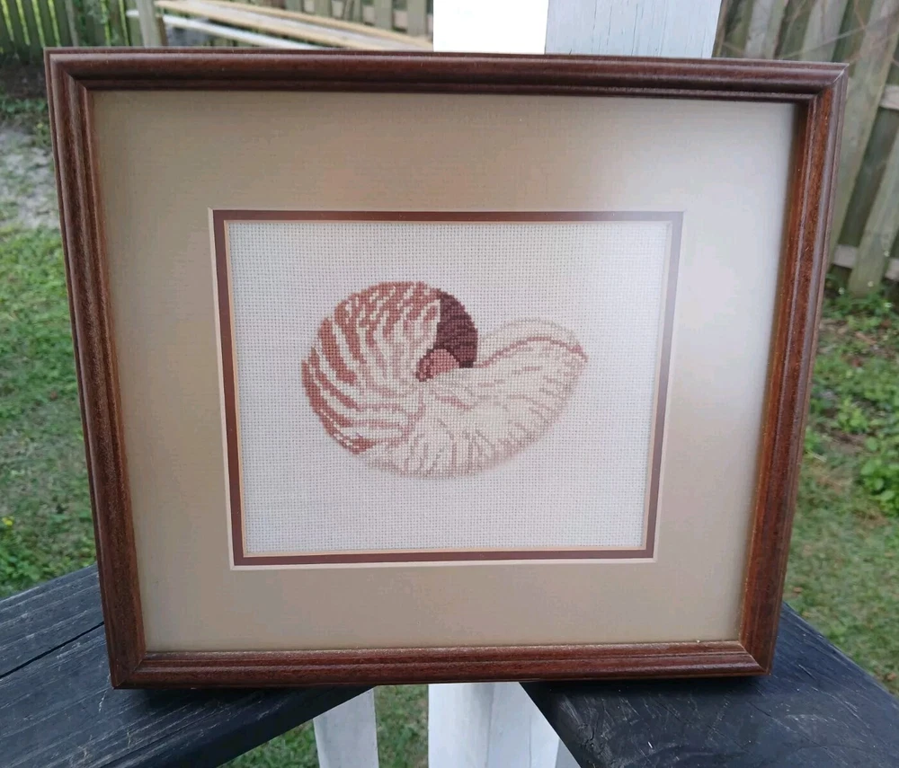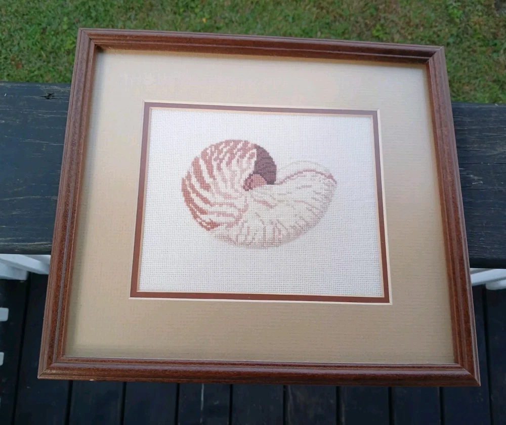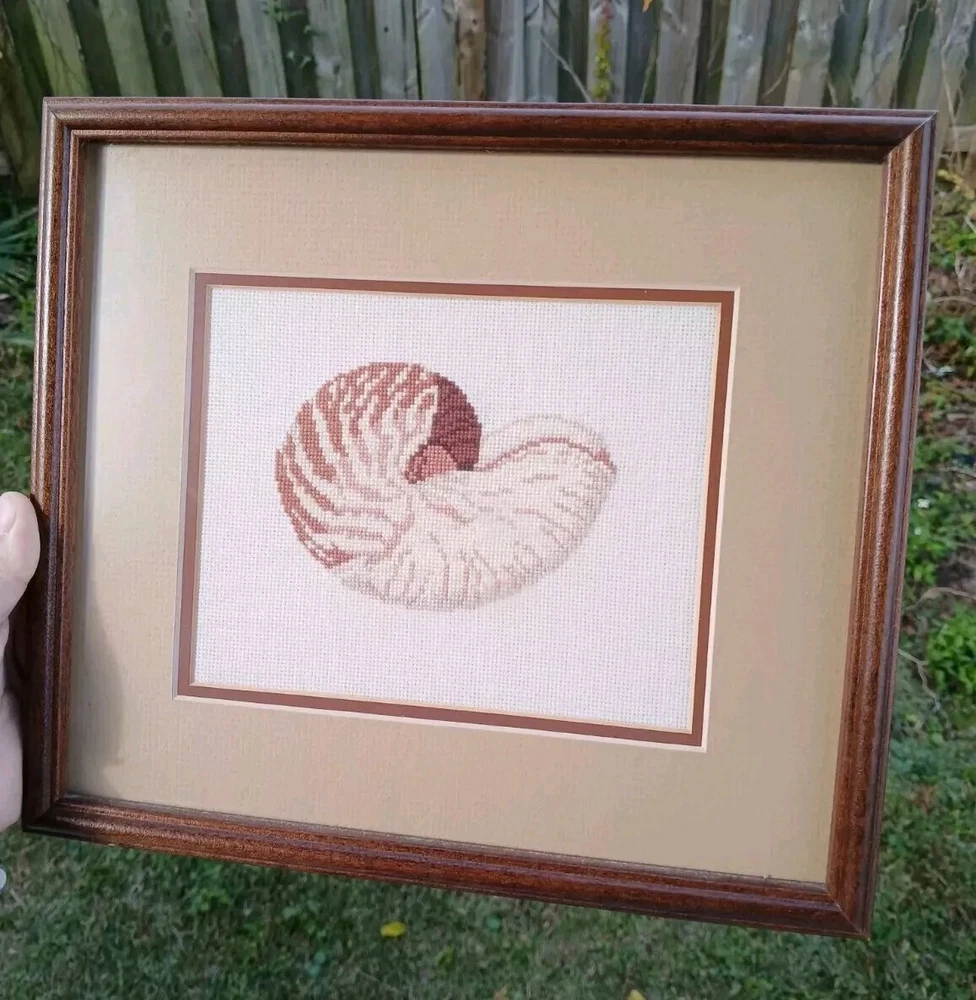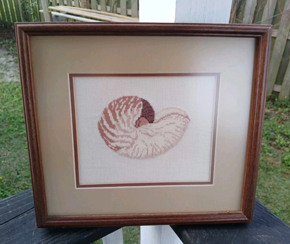 This beautiful framed cross stitch piece features a nautilus shell design, perfect for adding a touch of the ocean to any room. The embroidery was done by hand and is a finished product, ready to display. The frame is made of wood and adds to the overall charm of the piece. No scratches or imperfections. It's a really beautiful piece of art that brings warmth to a beachy, coastal themed home.
