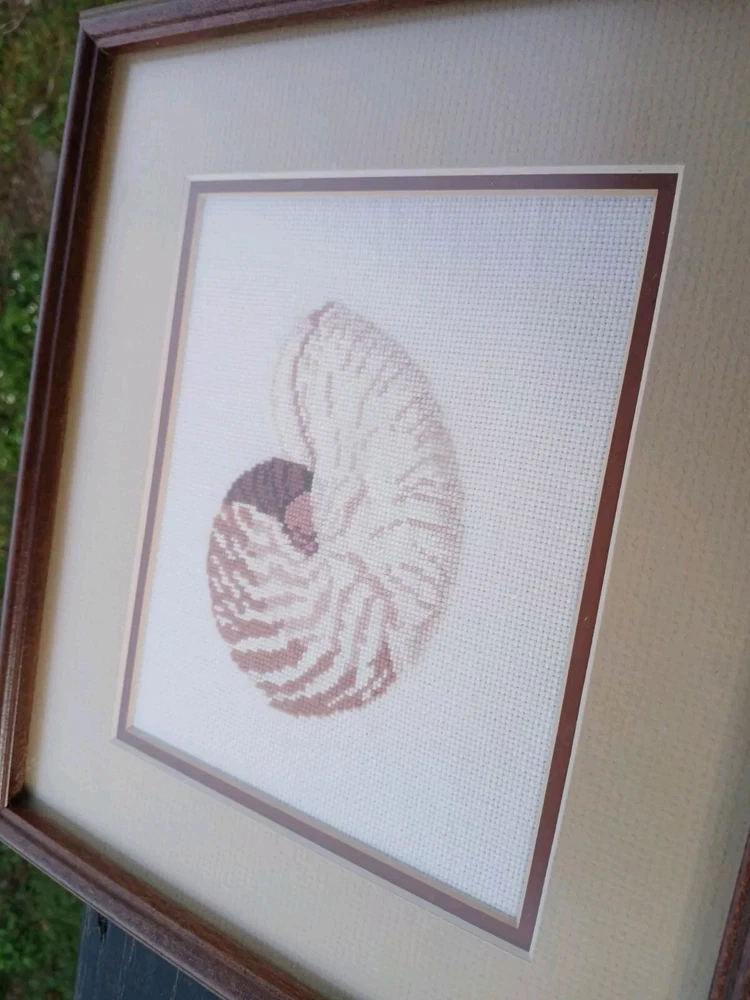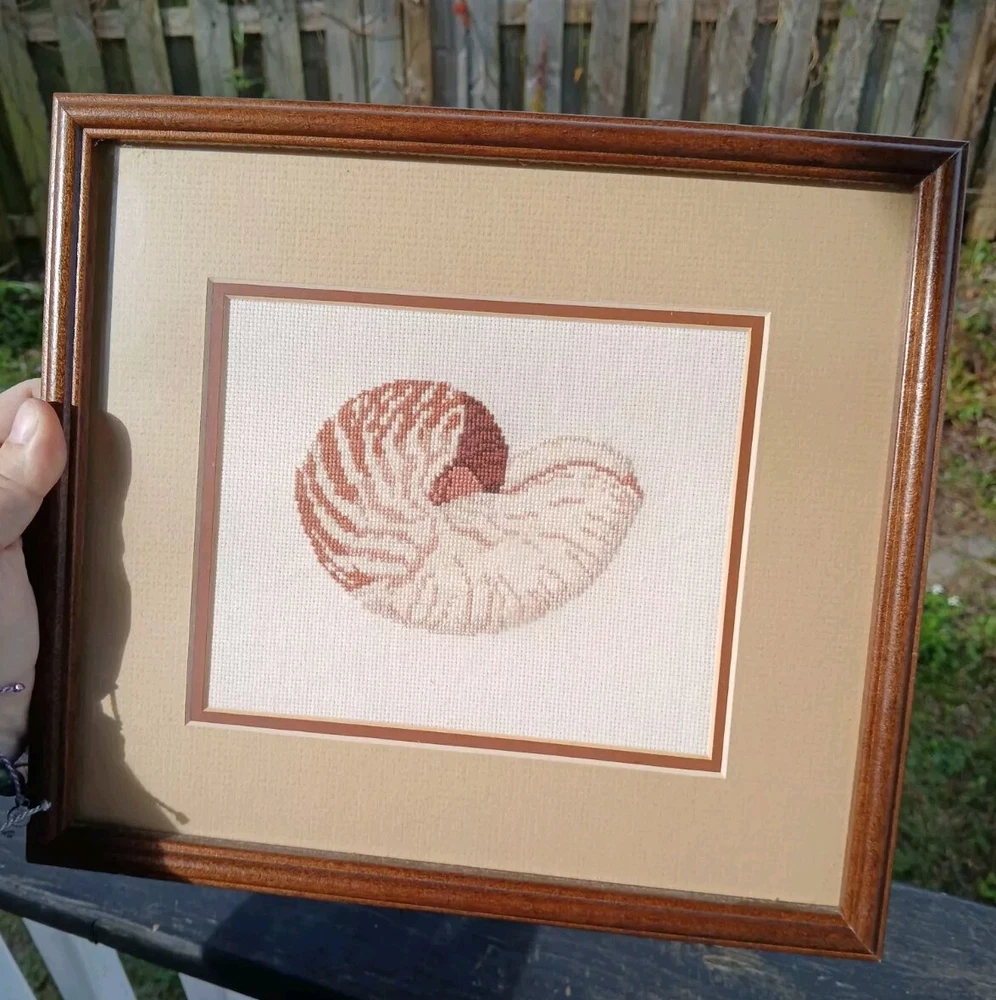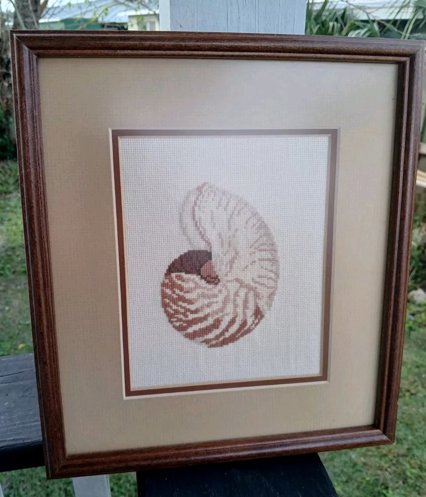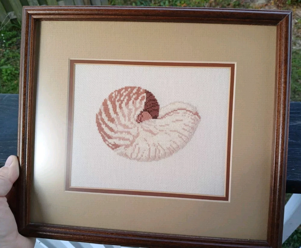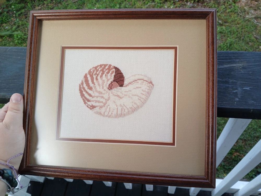 This beautiful framed cross stitch piece features a nautilus shell design, perfect for adding a touch of the ocean to any room. The embroidery was done by hand and is a finished product, ready to display. The frame is made of wood and adds to the overall charm of the piece. No scratches or imperfections. It's a really beautiful piece of art that brings warmth to a beachy, coastal themed home.