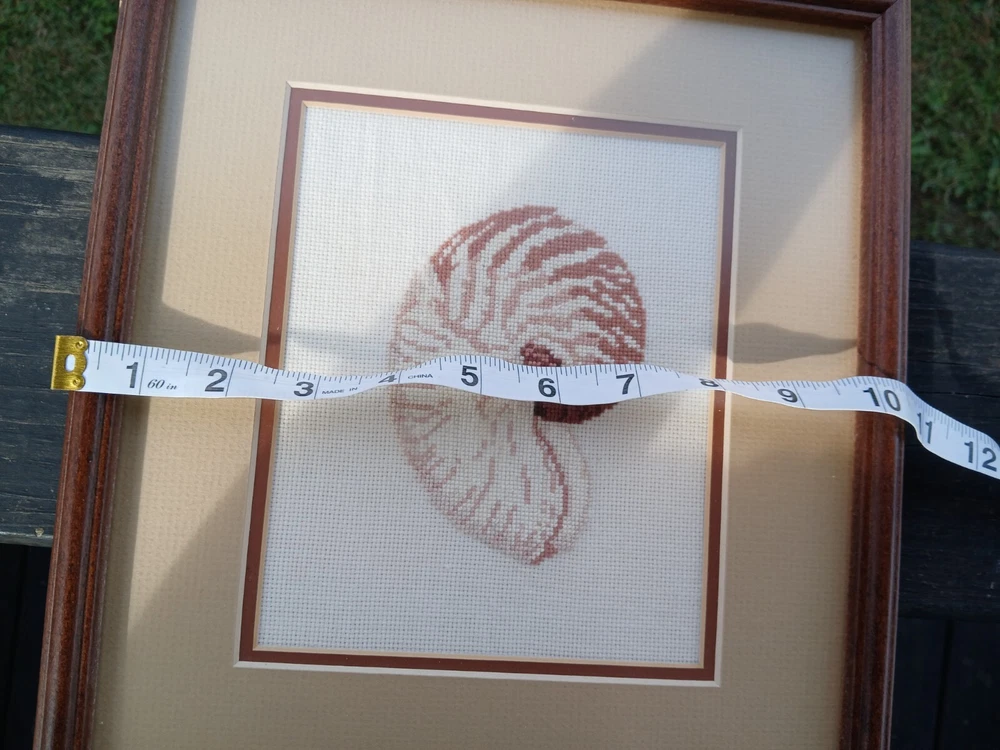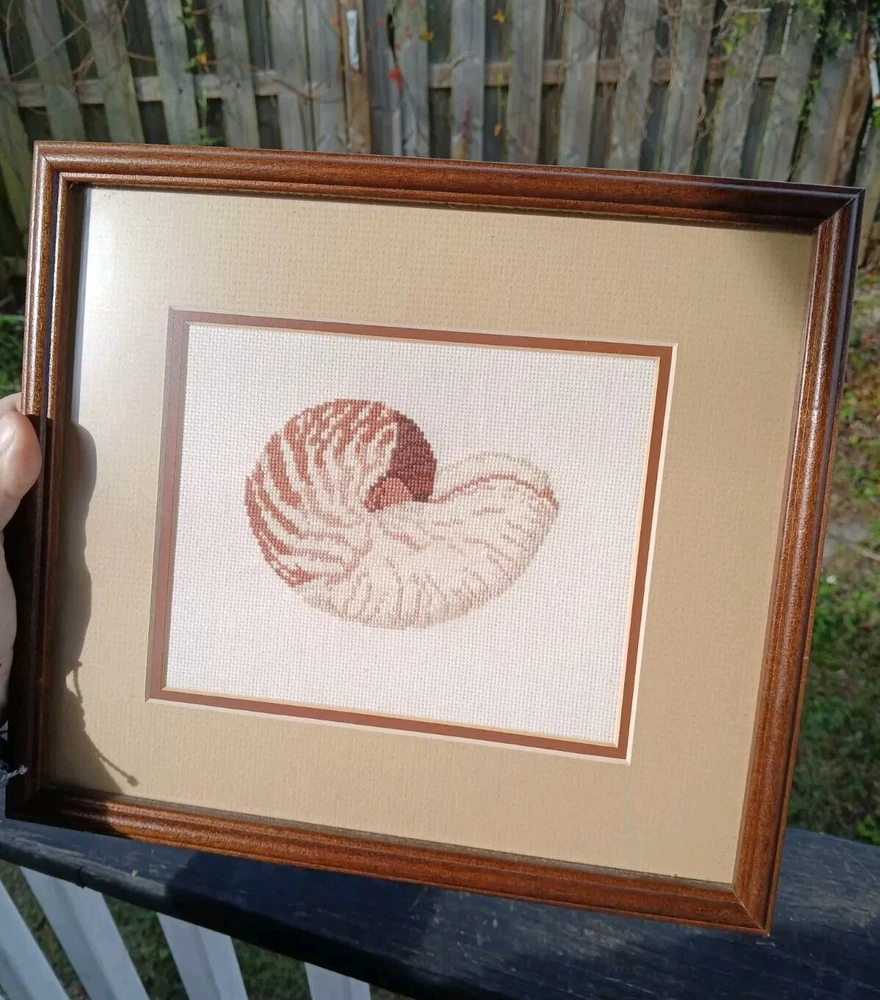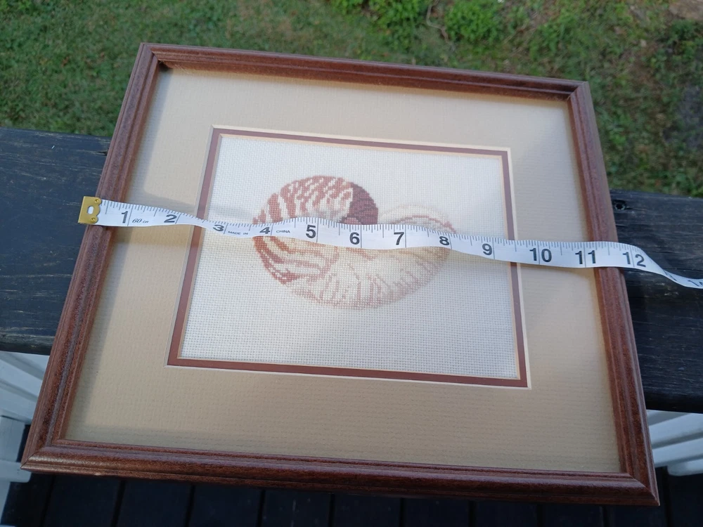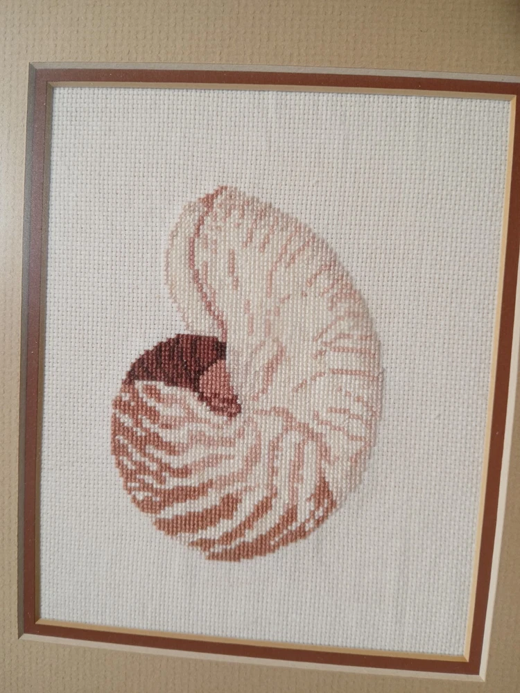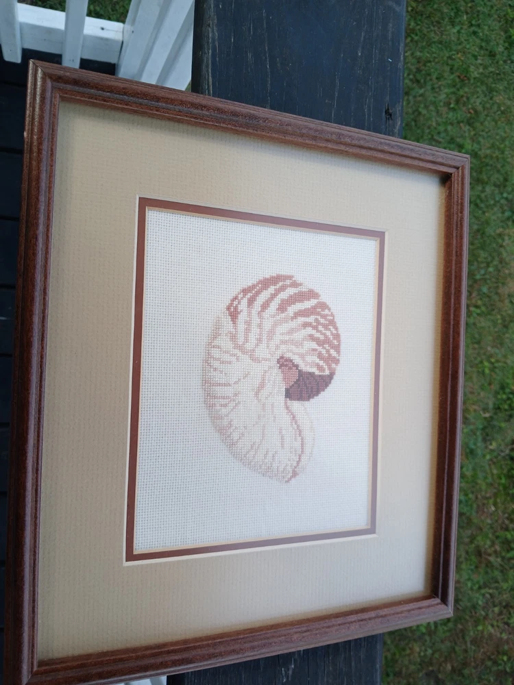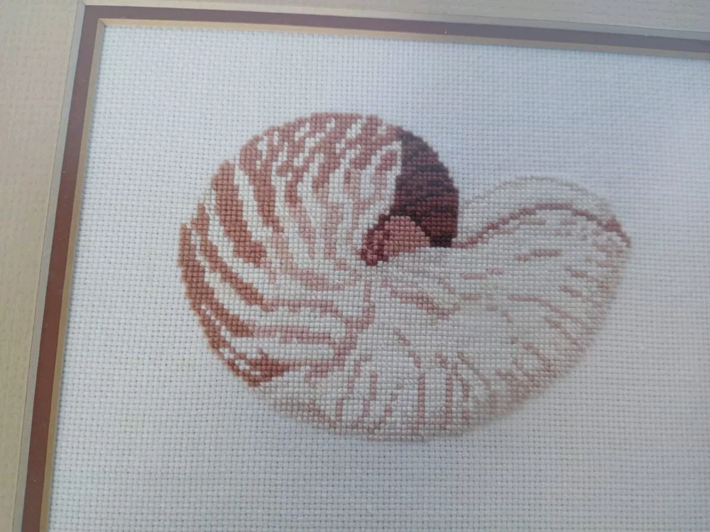 This beautiful framed cross stitch piece features a nautilus shell design, perfect for adding a touch of the ocean to any room. The embroidery was done by hand and is a finished product, ready to display. The frame is made of wood and adds to the overall charm of the piece. No scratches or imperfections. It's a really beautiful piece of art that brings warmth to a beachy, coastal themed home.