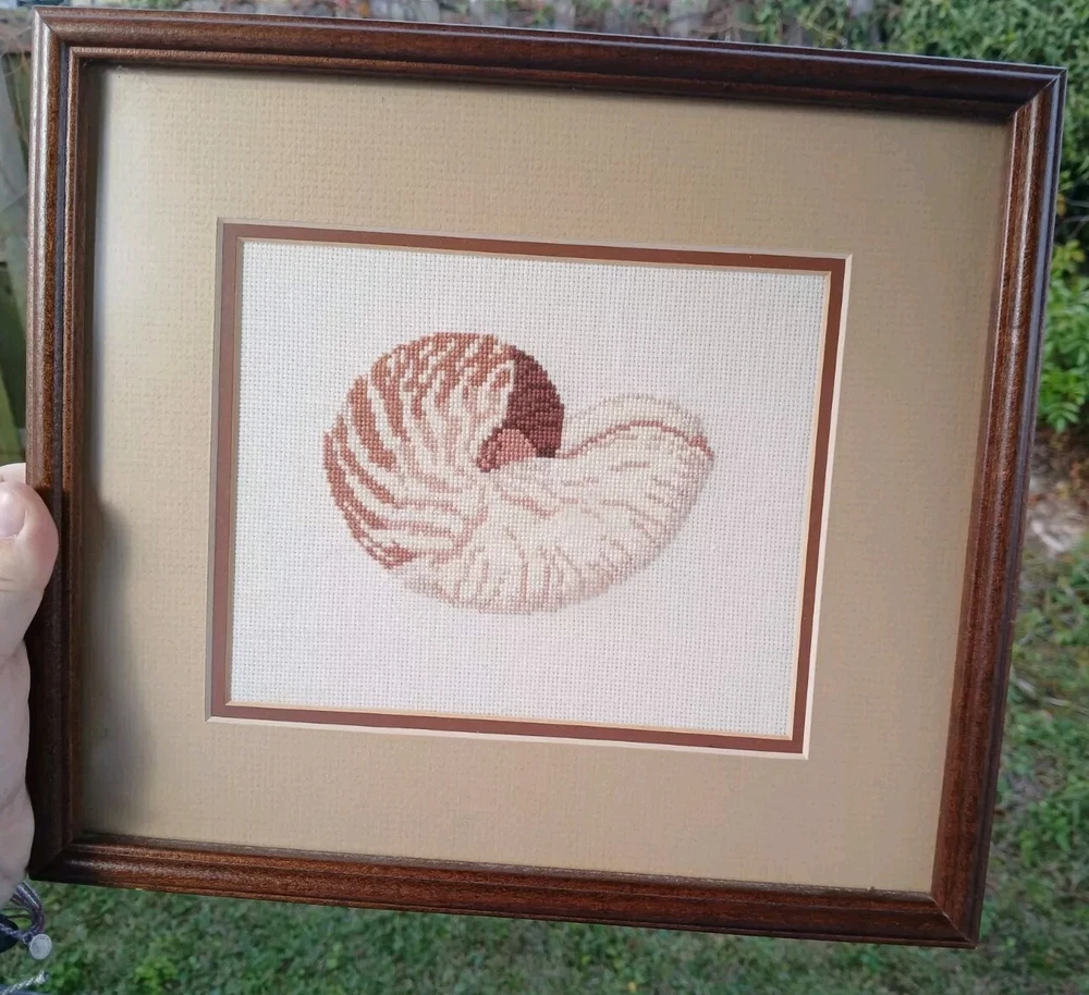 Framed Cross Stitch Nautilus Shell Nautical Wall Art Ocean Beach Home Decor Wood