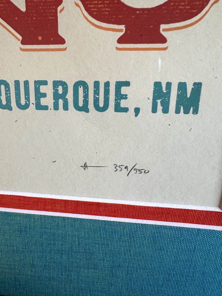 Capture a piece of music history with the 33" X 26" Framed Dead & Company Concert Poster from their performance at Isleta Amphitheater, in Albuquerque, NM on July 11, 2018. Very Rare numbered poster # 359 of 550. Poster signed by artist. Excellent condition. Celebrate the iconic Grateful Dead spin-off with this original piece, a must-have for any collector or fan of the rock and pop genre. Expertly crafted in the United States, this poster is not just a visual memento but a tribute to the enduring legacy of the band. It's a standout addition to any music memorabilia collection, bringing a touch of the Grateful Dead's spirited energy into your space. Poster description: Rustic red frame with a sheet of glass, turquoise outer matting, red/white inner matting; Cowboy silhouette on desert with mountains in background and lightening bolt in the sky above