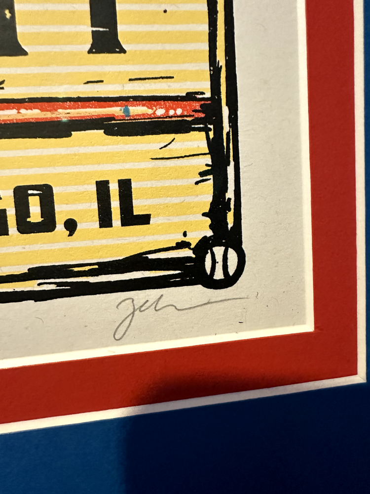 Capture a piece of music history with the 31" X 25" Framed Dead & Company Concert Poster from their performance at Wrigley Field, in Chicago, IL, Home of the Chicago Cubs on July 1, 2017. Very Rare numbered poster # 178 of 850. Poster signed by artist. Excellent condition. Celebrate the iconic Grateful Dead spin-off with this original piece, a must-have for any collector or fan of the rock and pop genre. Expertly crafted in the United States, this poster is not just a visual memento but a tribute to the enduring legacy of the band. It's a standout addition to any music memorabilia collection, bringing a touch of the Grateful Dead's spirited energy into your space. Poster description: Black frame with a sheet of glass, blue outer matting, red/white inner matting; Skeleton Hobo, Chicago Skyline, Red VW Bus