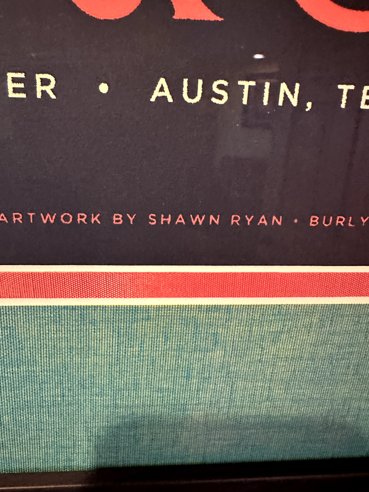 Capture a piece of music history with the 32" X 27" Framed Dead & Company Concert Poster from their performance at Frank Erwin Center, in Austin, TX on December 2, 2017. Rare numbered poster # 658 of 850. Poster artist is Shawn Ryan. Excellent condition. Celebrate the iconic Grateful Dead spin-off with this original piece, a must-have for any collector or fan of the rock and pop genre. Expertly crafted in the United States, this poster is not just a visual memento but a tribute to the enduring legacy of the band. It's a standout addition to any music memorabilia collection, bringing a touch of the Grateful Dead's spirited energy into your space. Poster description: Black frame with a sheet of glass, turquoise outer matting, red/white inner matting; Skeleton playing guitar with Austin skyline and turtles and bears dancing on a bridge below
