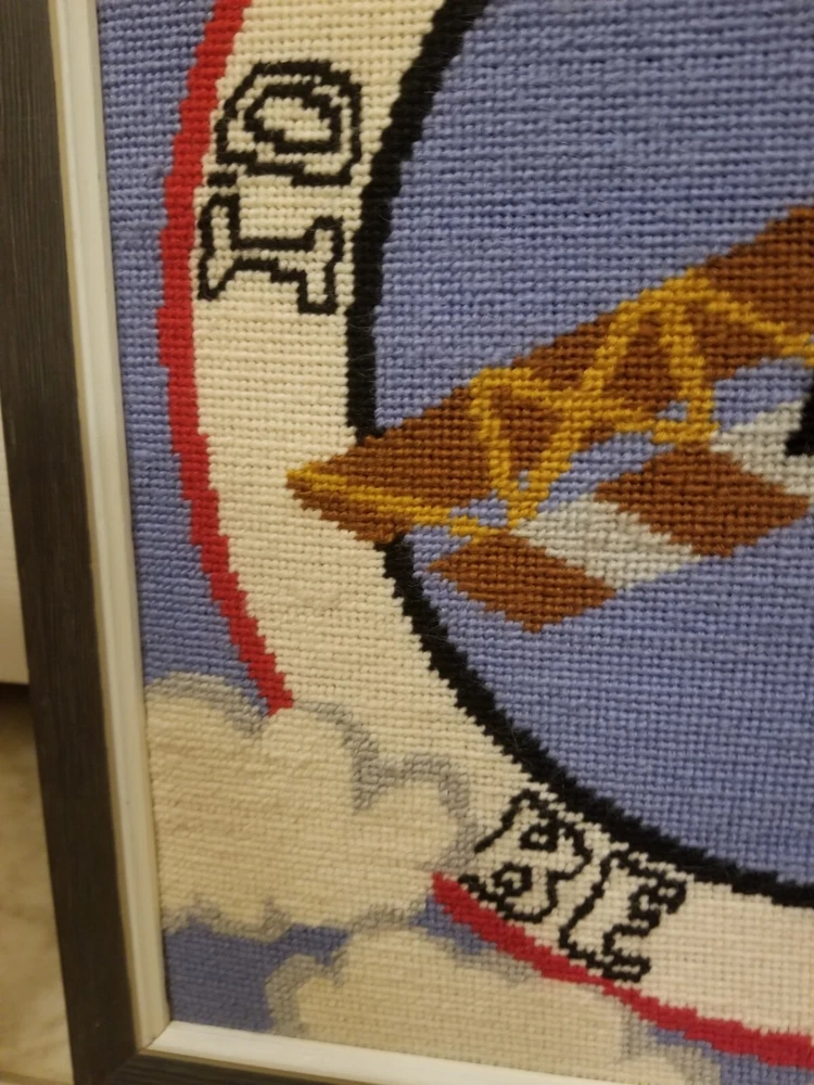 Framed 'I'd rather be flying' airplane needlepoint wall decor hand stitched vintage The frame is bout 15.5 x 15.5 inch, needlepoint is about 13.5 x 13.5 inch In good condition, the back has hanging wire