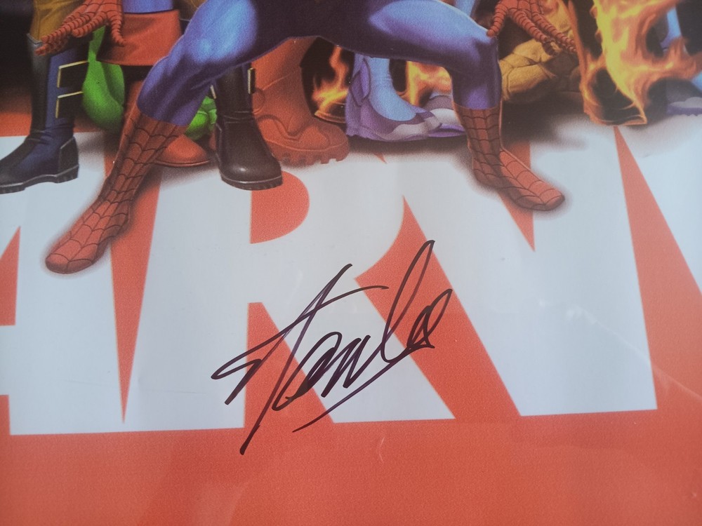 This product is a framed Marvel poster signed by Stan Lee, featuring the iconic characters of the Marvel Universe. As an original limited edition piece, this large-sized poster is a must-have for any Marvel fan or collector. The autograph from the legendary Stan Lee adds an extra layer of value and sentimental significance to this unique item. Displaying this piece in your home or office would make for a striking and nostalgic addition to any space.