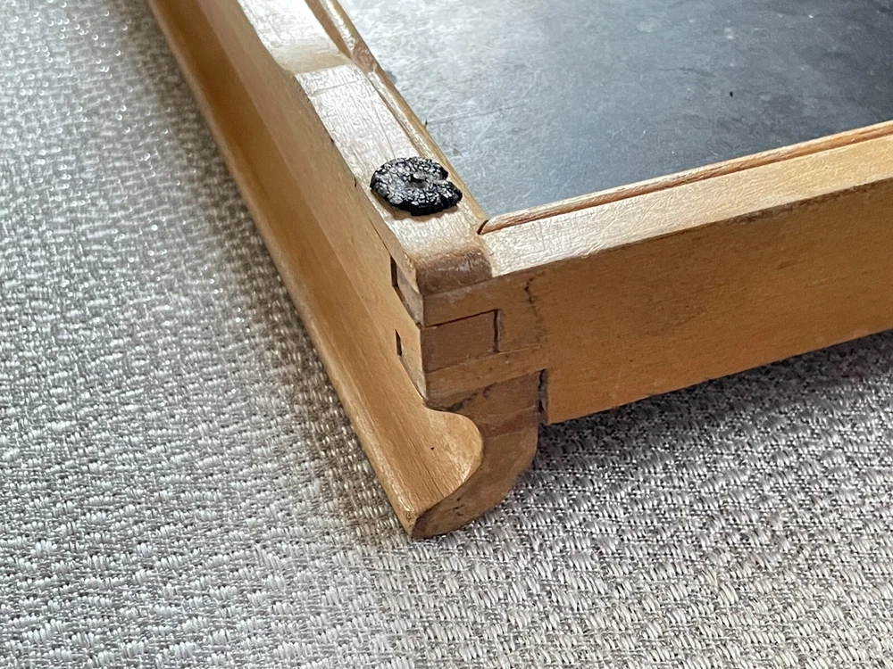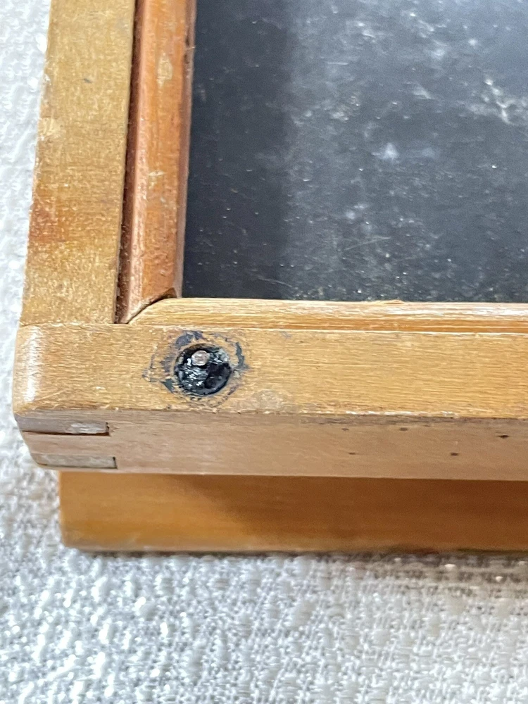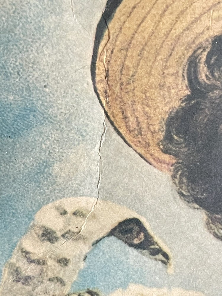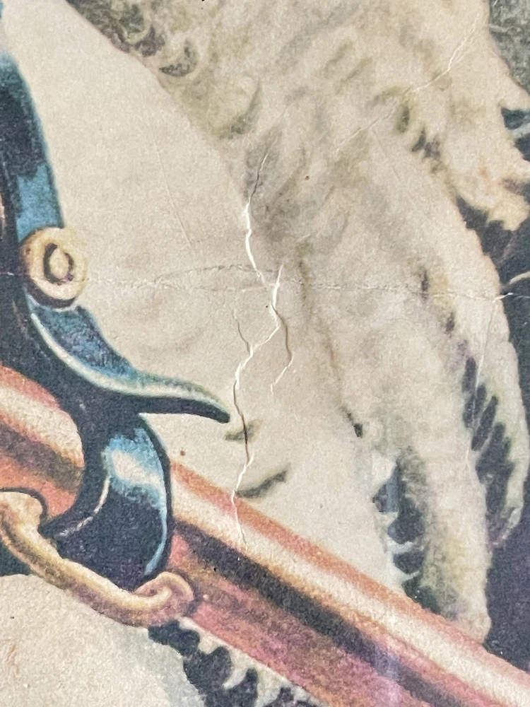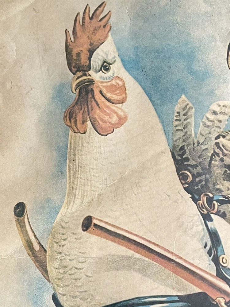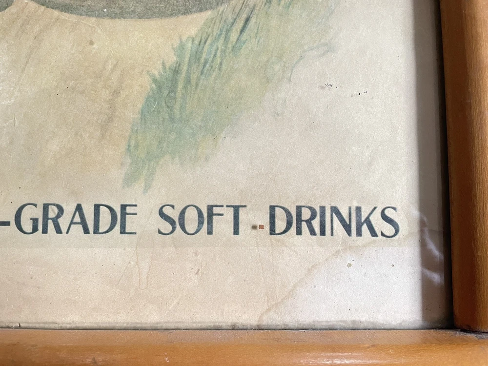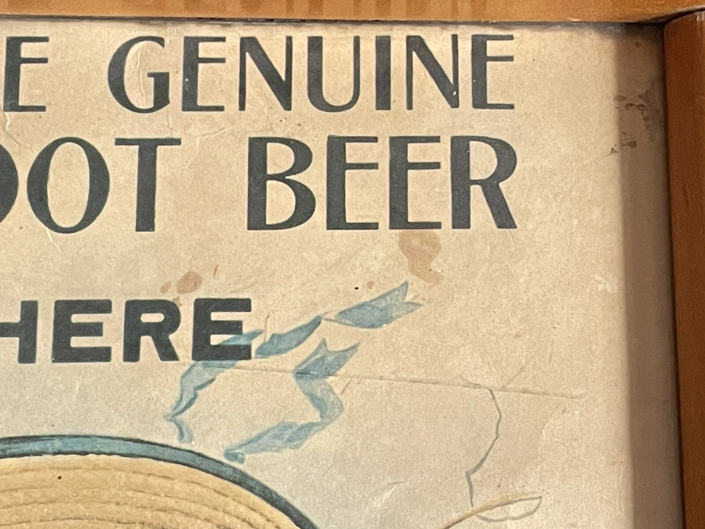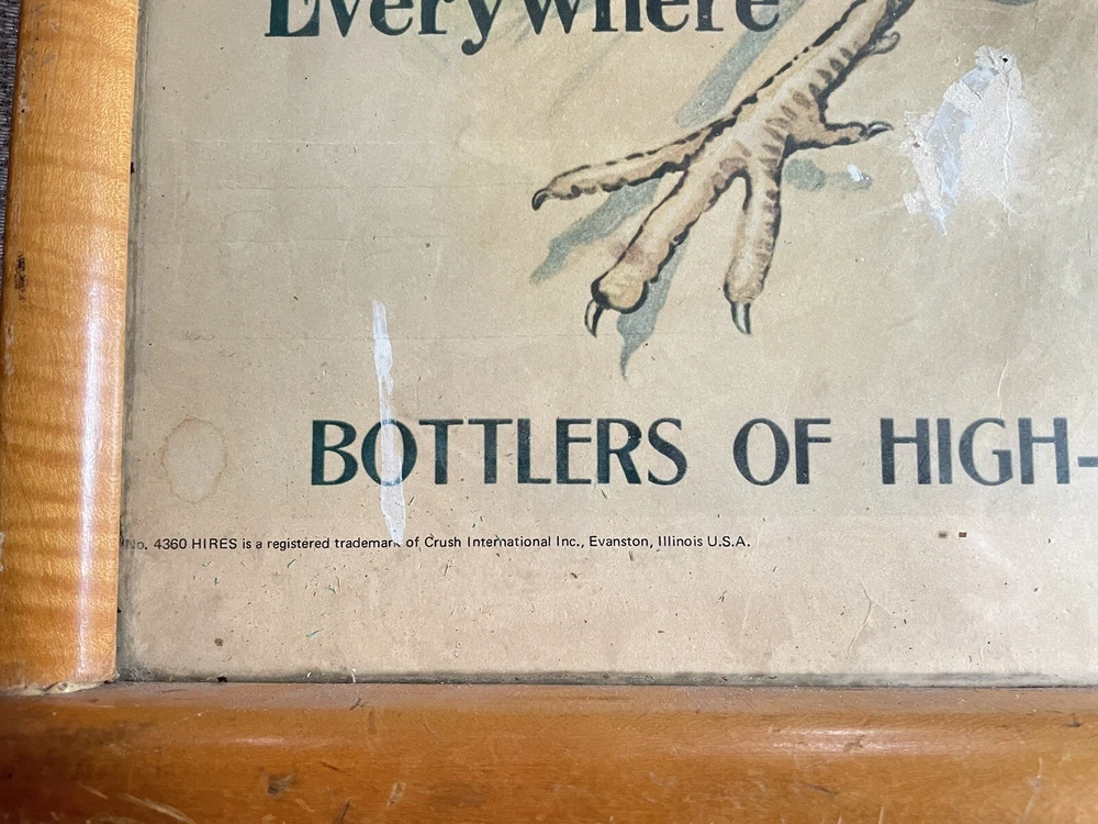 Early Hires Root Beer Paper Lithograph with vibrant detail featuring a Large Rooster pulling a wagon and toddler. The paper has good color throughout with some browning/discoloration or stains. There is a horizontal fold line with some and scattered creases and I believe a couple white paint spots. I’m not sure if this item was modified or cut down to fit the Oak wood frame but more than likely was for a correct fit. The frame is solid but is dirty with minor scratches, stains and has glued corners. Overall size is 15.5” x 23.75”