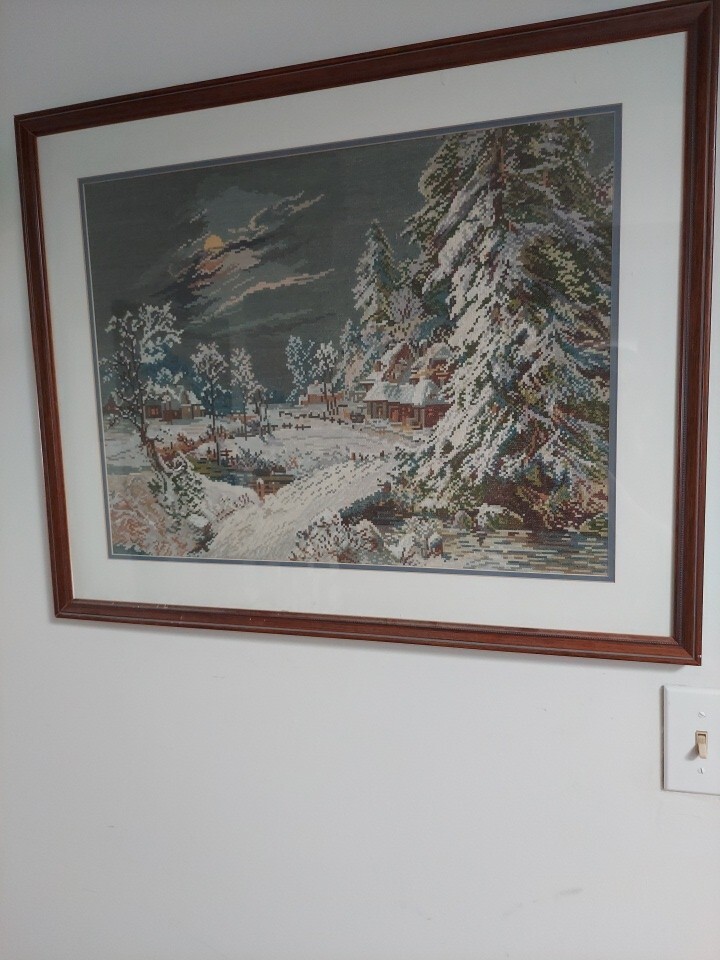 This is original Wiehler needlepoint. My mother made it in 1970s. It is framed. I am downsizing my home and will sell this piece to anyone who loves vintage needlepoint. I recall that it took my mom 6 months to complete this work. Framed size is 24"x 30" (61cm x 76cm).