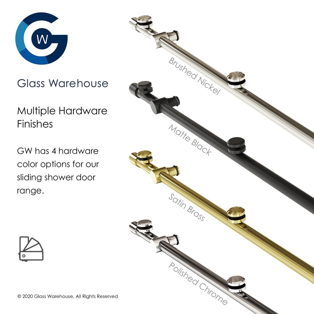 Upgrade your bathtub with the high-end Eclipse sliding door model by Glass Warehouse. Enjoy the superior quality and durability of 3/8" frameless tempered glass panels, treated on both sides with EnduroShield coating to repel water and soap residue. The sleek design features solid brass hardware in a variety of color finishes to match any bathroom decor. The shower enclosure is fully reversible and effortlessly slides on high-quality stainless-steel rollers.Features: 3/8" tempered glass panels EnduroShield coating repels water and soap residue Solid brass hardware in multiple color finishes Fully reversible shower enclosure Effortless sliding on high-quality stainless-steel rollers Free Shipping Over $49.99* Details Glass Warehouse 56 in. - 60 in. x 60in. Frameless Bath Tub Sliding Shower Door Product Description: Upgrade your bathtub with the high-end Eclipse sliding door model by Glass Warehouse. Enjoy the superior quality and durability of 3/8" frameless tempered glass panels, treated on both sides with EnduroShield coating to repel water and soap residue. The sleek design features solid brass hardware in a variety of color finishes to match any bathroom decor. The shower enclosure is fully reversible and effortlessly slides on high-quality stainless-steel rollers. Features: 3/8" tempered glass panels EnduroShield coating repels water and soap residue Solid brass hardware in multiple color finishes Fully reversible shower enclosure Effortless sliding on high-quality stainless-steel rollers