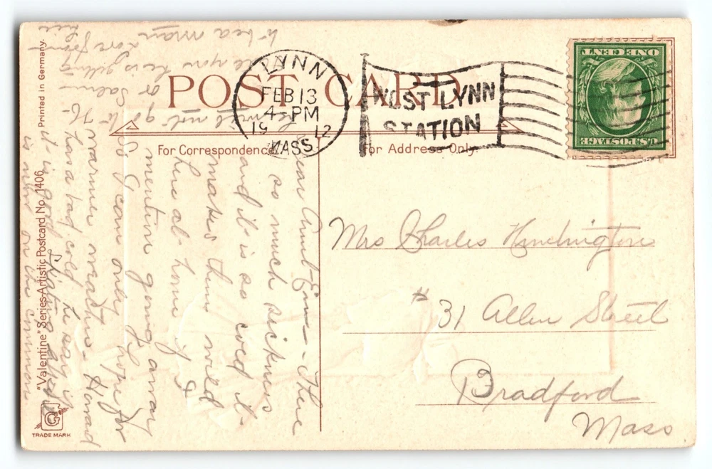 Unsigned artist Frances Brundage. Posted with 1912 cancel. Antique original vintage post card. Has light corner dings and age wear. Stock #VAL152. Additional postcards are in our store. All post cards are old originals and may or may not have writing on back. Bundle and save by using cart and making single payment.