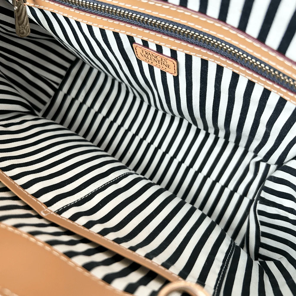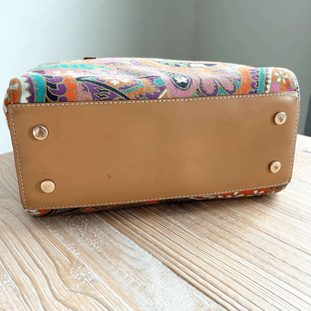 Frances Valentine Henry Canvas Tote Multi Color Print Leather Trim. Excellent used condition with no flaws. This structured bag design is complete with a colorful canvas frame, front zipper details, and interior compartments for organizing. Leather bottom with feet. Interior and exterior zippered pockets. Adjustable and detachable crossbody strap. Brushed cotton twill lining. Made in Italy. Dimensions approx: 10.5''W x 9”H x 5”D Handle Drop: 6''