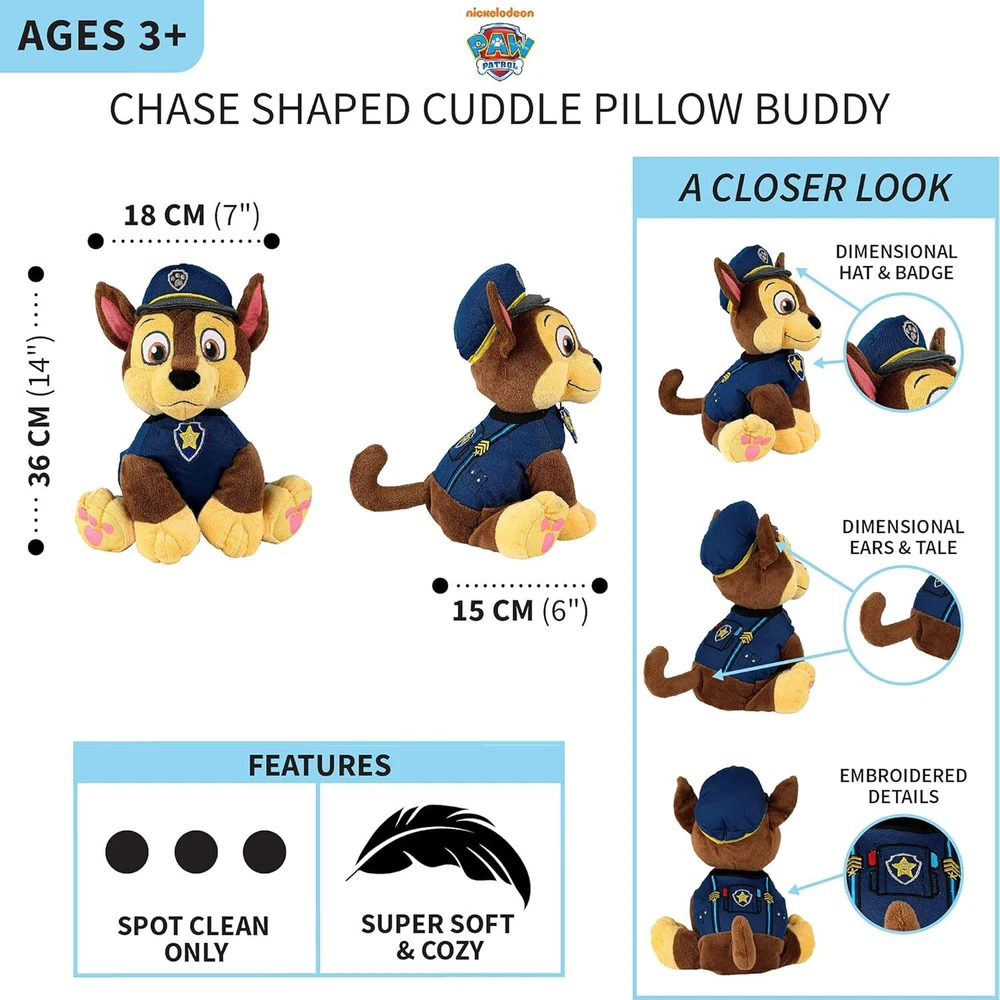 About this item PAW PATROL CHASE DESIGN: Fans of the popular Nickelodeon animated series Paw Patrol will love cuddling up with this Chase shaped cuddle pillow. Fun dimensional and embroidered details help bring out the brave spirit and adorable style of Chase the police dog. FUN AND CUDDLY: This cuddle pillow brings Chase to life with fun character details that include dimensional ears, tail and police hat along with an attached backpack and instantly recognizable embroidered facial details. A great travel accessory for use in home, car, camping and sleepovers for napping and cuddling. SOFT PLUSH QUALITY: Your little one would love to hug and snuggle up with their favorite pillow pal by their side. Made of super soft plush material, this pillow pet is a comfy and colorful accessory to a child's bedroom, nursery, playroom and a cute home decor addition. ITEM INCLUDES: The Paw Patrol Chase character shaped plush cuddle pillow buddy measures approximately 36CM (14") x 18CM (7") x 16CM (6"). The perfect size to snuggle while sleeping or as a stuffed animal for toddler and children play time. EASY CARE: To maintain the animated cartoon character's color and vibrancy, simply spot clean as needed. › ||DPSP-AMB097CJV6CM Our Store We have more items available. Please check them out. Shipping & Handling Flat shipping rate, if specified, does not apply to Canadian territories and remote areas. For U.S., flat shipping rate only applies to lower 48 states. Please contact us for shipping rate if flat shipping rate does not apply to you. Upon receipt of payment, item will ship via Canada Post surface or UPS, Fedex Ground service or another economic service within the timeline specified in item listing. If possible, we will combine shipping for multiple items. International Orders Import duties, taxes, customs fees and charges are not included in the item price or shipping charges. These charges are normally collected when you pick up the package. Please check with your country's customs office on what these additional charges will be prior to buying the item(s). International buyers are responsible for these charges. Please note that package shipped from outside your country can be held up in customs and it can cause delay in shipping time. This is beyond our control and there is nothing we can do to speed up the process. Sales Tax For the Canadian buyer, applicable retail sales tax will be charged. Taxes are charged on both Item Price and Shipping & Handling charges if applicable. Store Policy Sales Agreement Upon purchase, you have entered a binding contract under the terms of the listing. If an item is out of stock or on backorder , you will be notified and given the option to wait for the item to become available, choose another item, or a full refund. Backordered items are shipped as they become available. Return and Refund Unless specified otherwise, every item purchase (except health, hygienic, food products and items with No Return Accepted specified in the listing) comes with unconditional money back guarantee minus shipping & handling charge and 20% restocking fee . Before returning, please contact us for a RMA number. All returns must come with a RMA number. Return without a RMA number will NOT be accepted. Buyer is responsible for the shipping cost of returning the item(s) to us and all original shipping, handling, insurance, and other fee associated with the returned item(s) are not refundable. For free shipping item(s), we still pay for shipping when sending item(s). The shipping cost associated with free shipping item(s) is not refundable. All merchandise returned must be in its original states with tag intact, undamaged, clean and unused. Any return must be made within 30 days of receipt. Upon receipt and careful examination of the returned merchandise, refund will be issued and you will be notified after the refund is processed. Please allow 5 business days from the time we receive your returned item(s) for your refund to be issued. Communication All communication must be conducted via online message. We do not offer customer service over the phone. We answer all messages promptly, usually within 1-2 days. As a general note, if you do encounter a problem with your item(s), please contact us as soon as possible before leaving a negative feedback. We will do our best to help you. Contact Us For local pickup, special requests and special offers, please contact us.