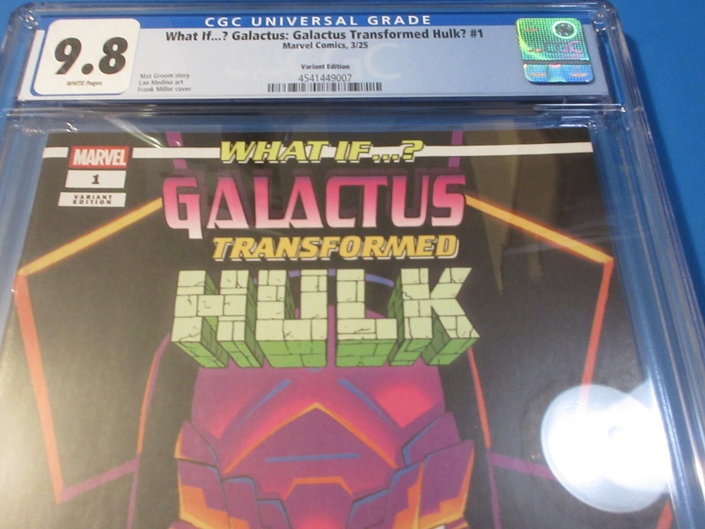 This Frank Miller variant is a must-have for any serious collector! The CGC 9.8 grade ensures pristine condition, and the fresh case makes it pop. Love the bold "What If?" concept of Galactus transforming Hulk—such a killer combo. The bonus offer is a sweet deal if you grab multiple auctions. Super affordable flat-rate shipping too. Don’t miss out on this gem!