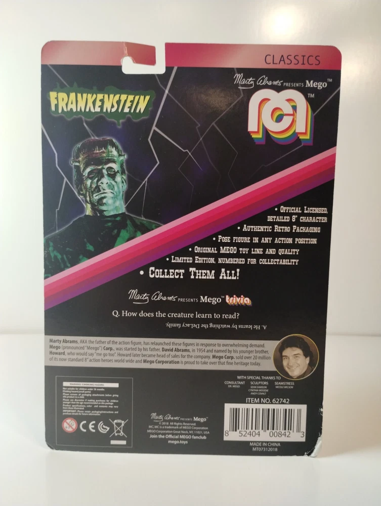 Mego Frankenstein 8 inch figure sealed in package. NlMarty Abrams presents Mego number 6620 / 10000. Packaged has wear on edges, corners and hang tab pictured. Ships carefully packaged in a sturdy box USPS Ground Advantage.