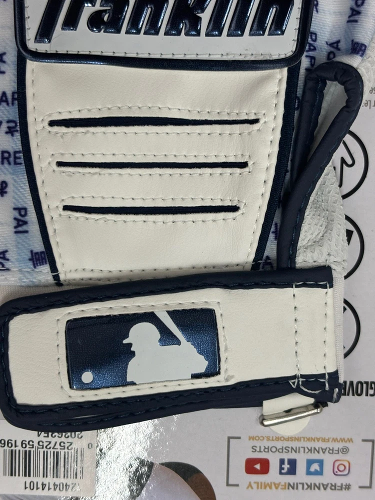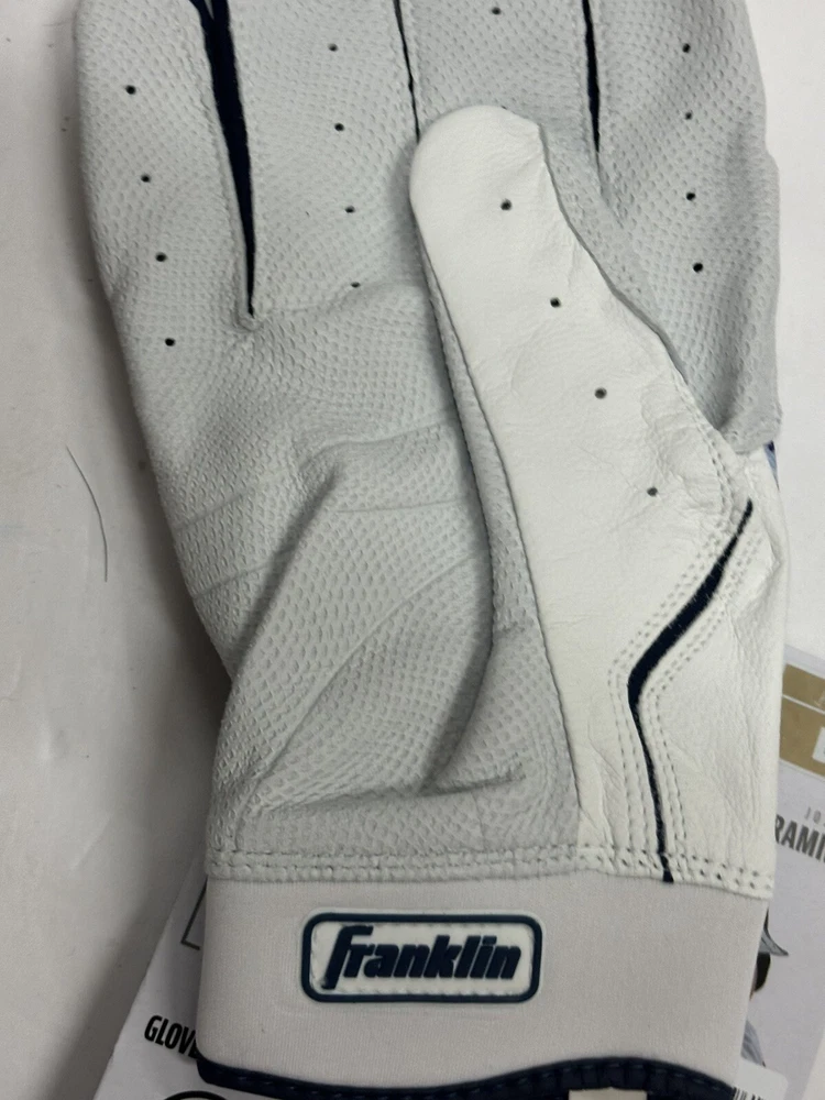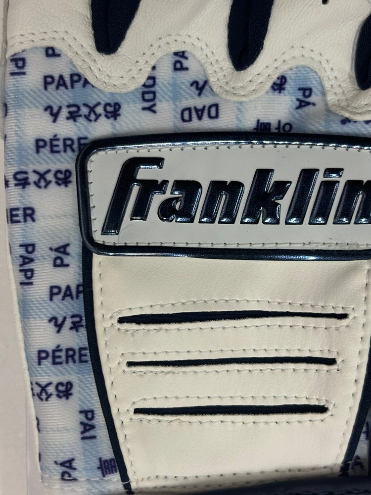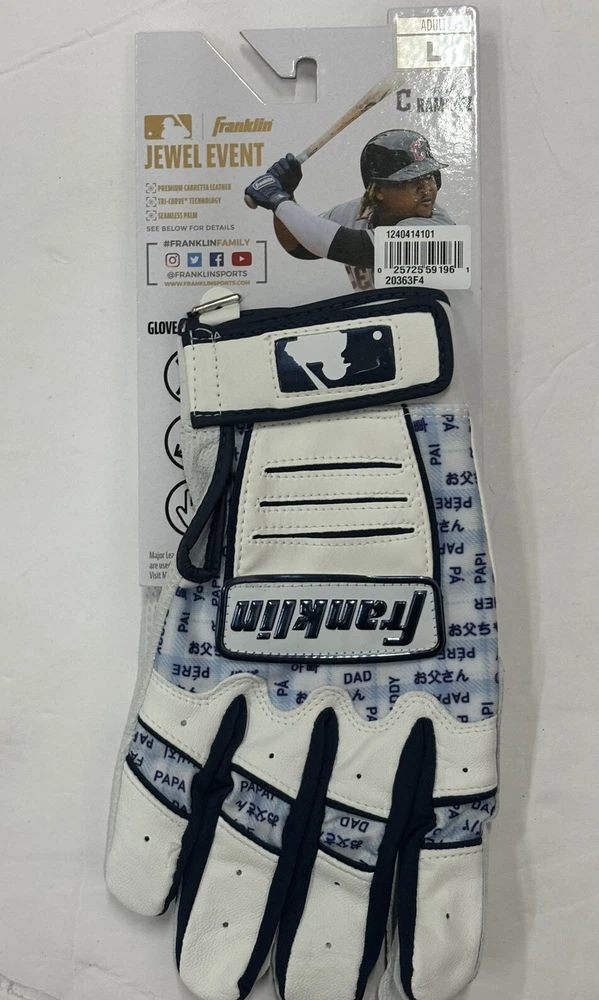 Men's Large Fathers Day 2024 Franklin batting gloves Jewel Event MLB Batting Gloves white w navy Has Dad and Papi and Dad in Japanese printed on gloves Great looking color limited edition tough to find We ship right away Same ones used in MLB
