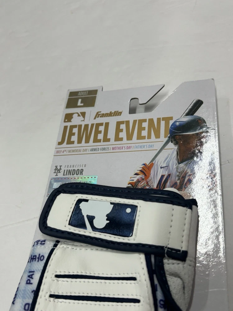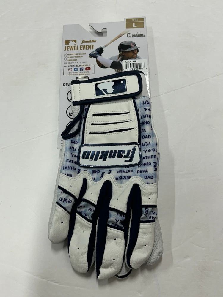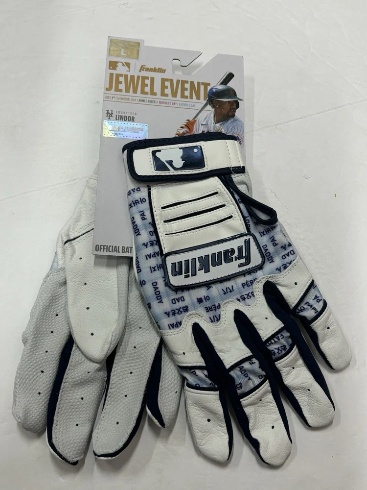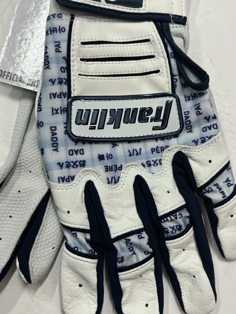These Franklin Fathers Day Pro MLB Jewel Event Batting Gloves are the perfect addition to any baseball player's gear. With a sleek white and navy gray design, they are both stylish and functional. Made for men in size L, these batting gloves are suitable for all-purpose player positions at the plate. The gloves feature the Franklin brand and are designed for the 2024 model year. Whether you're a professional player or just enjoy playing for fun, these gloves are sure to impress. Only found in the pros. Brand new with tags! Ships for $4.99