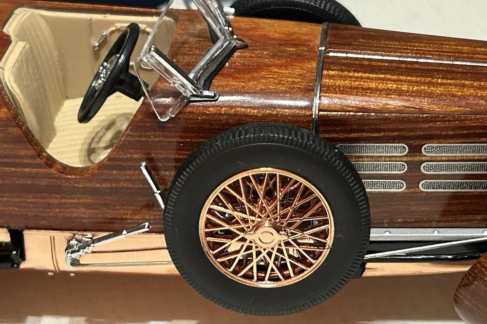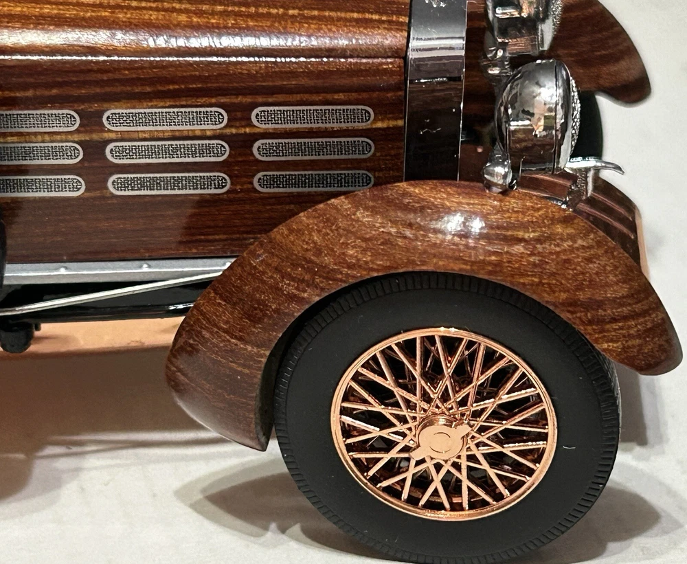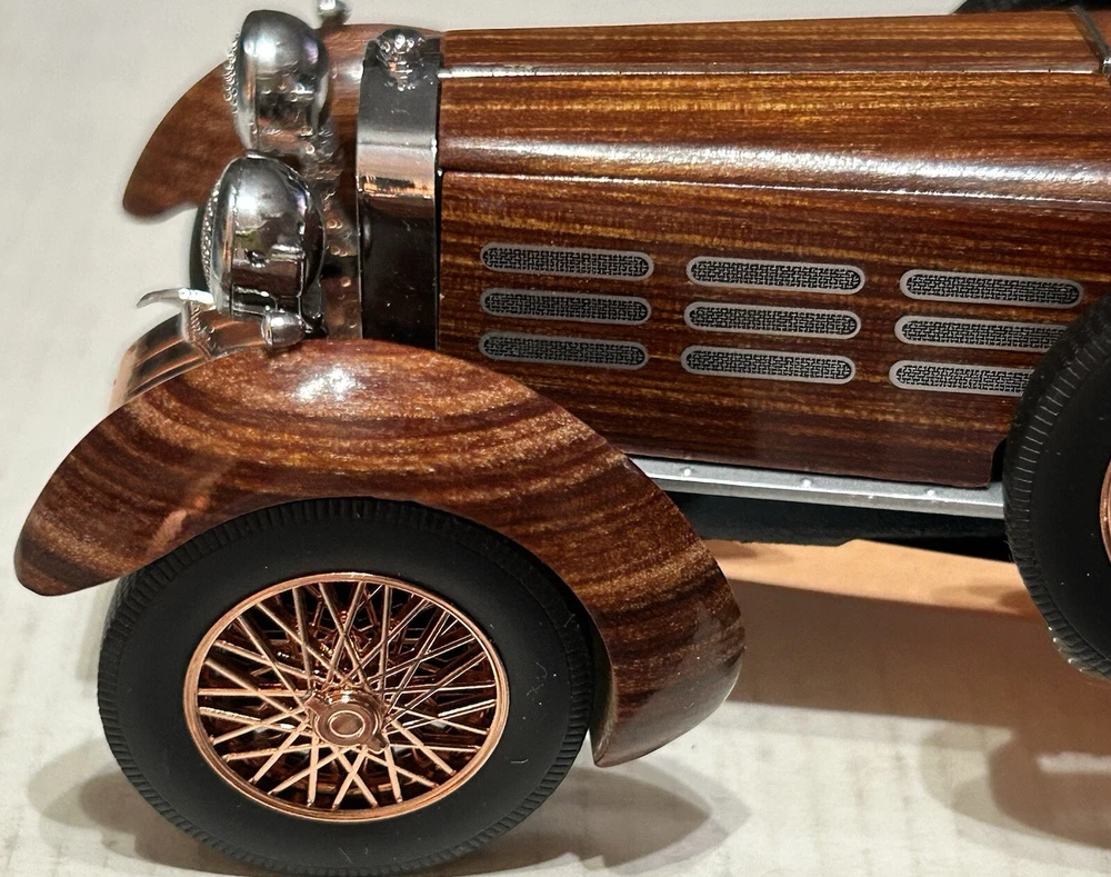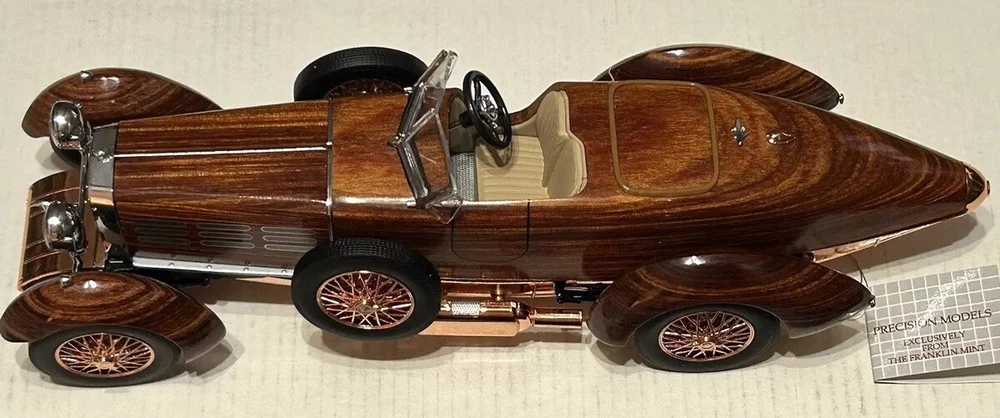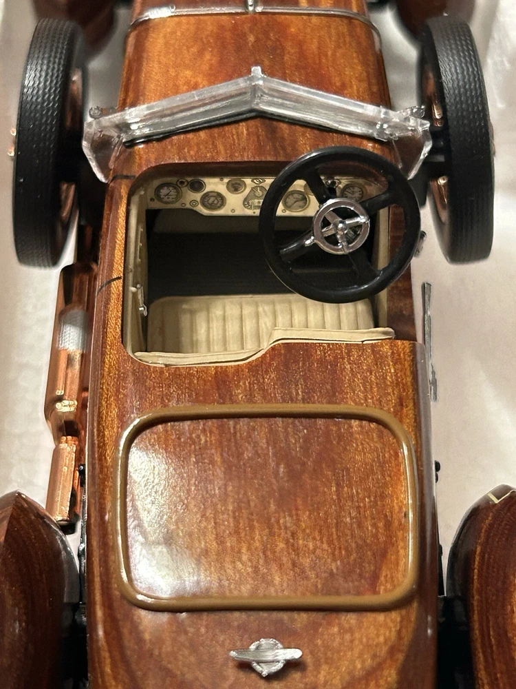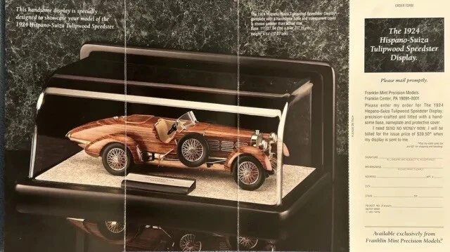Here’s a Franklin Mint 1924 Hispano-Suiza Type H6c Speedster Model Replica was exclusively offered in 1993 to their Franklin Mint Club Members. The original 1924 Hispano-Suiza Type H6c Speedster Automobile dubbed “Queen of the Road” was a very expensive purchase and was beloved by King Alfonso XIII, who in 1905 purchased his first and inspired him to buy one every new production year from then on. During World War I, Hispano-Suiza earned a formidable reputation for building fast dependable aircraft engines with more than half of all aircraft being powered by Hispano-Suiza aircraft engines. Encompassing the same standards and vision as the aircraft engine, the Type H6c automobile was built at the same Hispano-Suiza Aircraft Factory producing power, speed, and durability. Hand-Assembled and Hand-Finished using the finest Tulipwood and Genuine Copper materials, this magnificently crafted work of art includes the signed Certificate of Authenticity, Hang Information Tag, The Care and Handling Instructions, Technical Specifications Data, The Hispano-Suiza Type H6c Speedster Tulipwood Story, Both Engine Plan and Driver’s Compartment Layouts, Display Case Full-Color Brochure, Custom Styrofoam Container, and Shipping Box. Take advantage of this opportunity to add this unique pristine museum level of superior magnificent’s to your collection today.