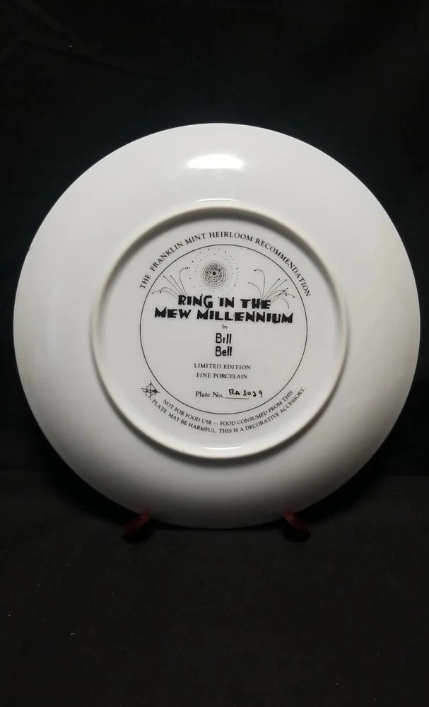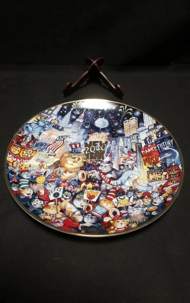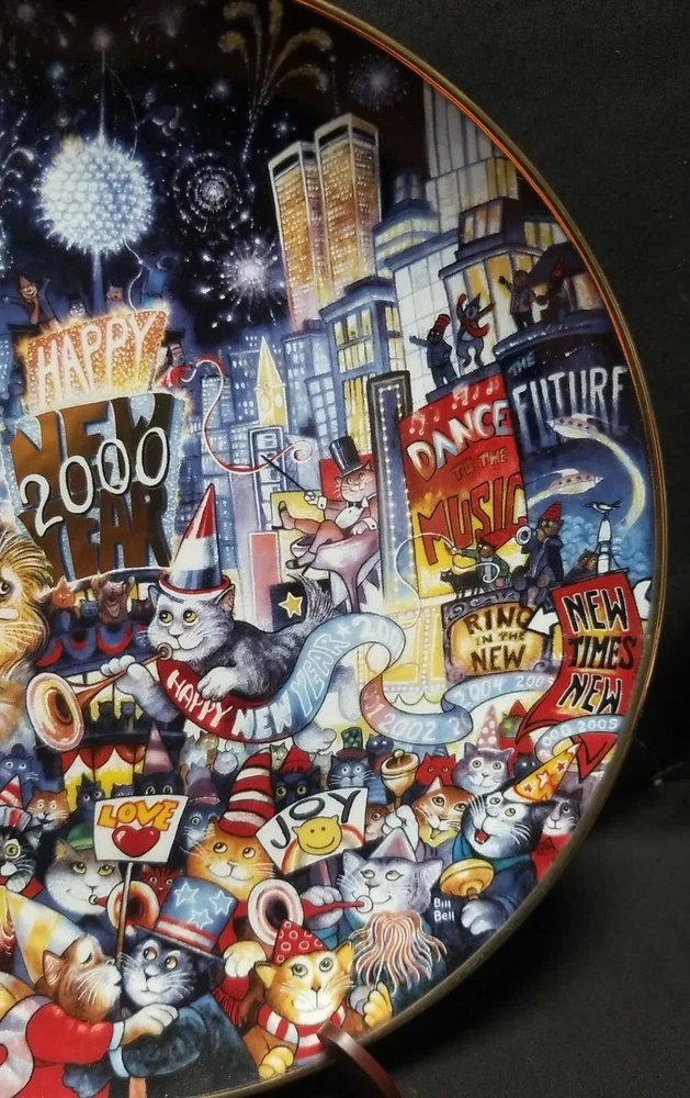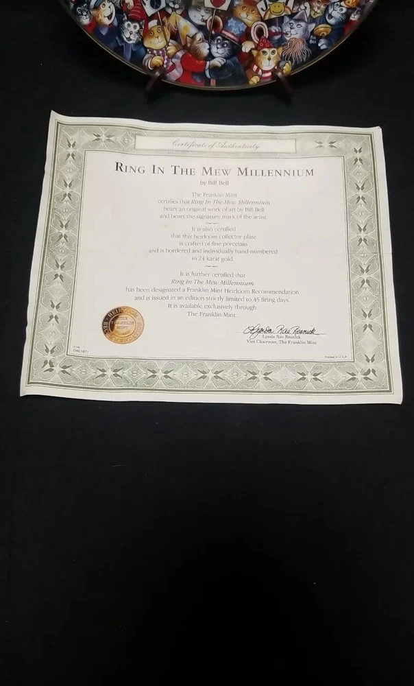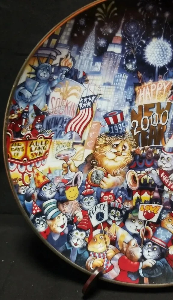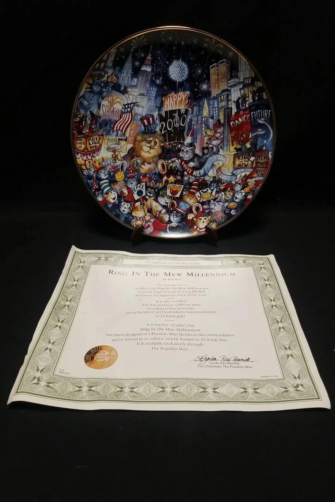 Celebrate the turn of the millennium with this limited edition collector plate from Franklin Mint. Featuring a playful cat design by artist Bill Bell, this fine porcelain plate is a must-have for cat lovers and collectors alike. The multicolor design is perfect for any decorative setting, and the included stand makes it easy to display. This unique piece is perfect for commemorating the new year and adding to your collection. Whether you're a fan of American culture, cats or are just looking for a decorative piece, this Franklin Mint plate is sure to impress. No visible chips or cracks. Ships in padded box.