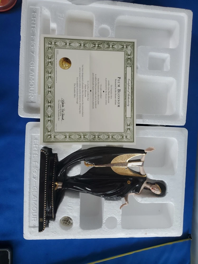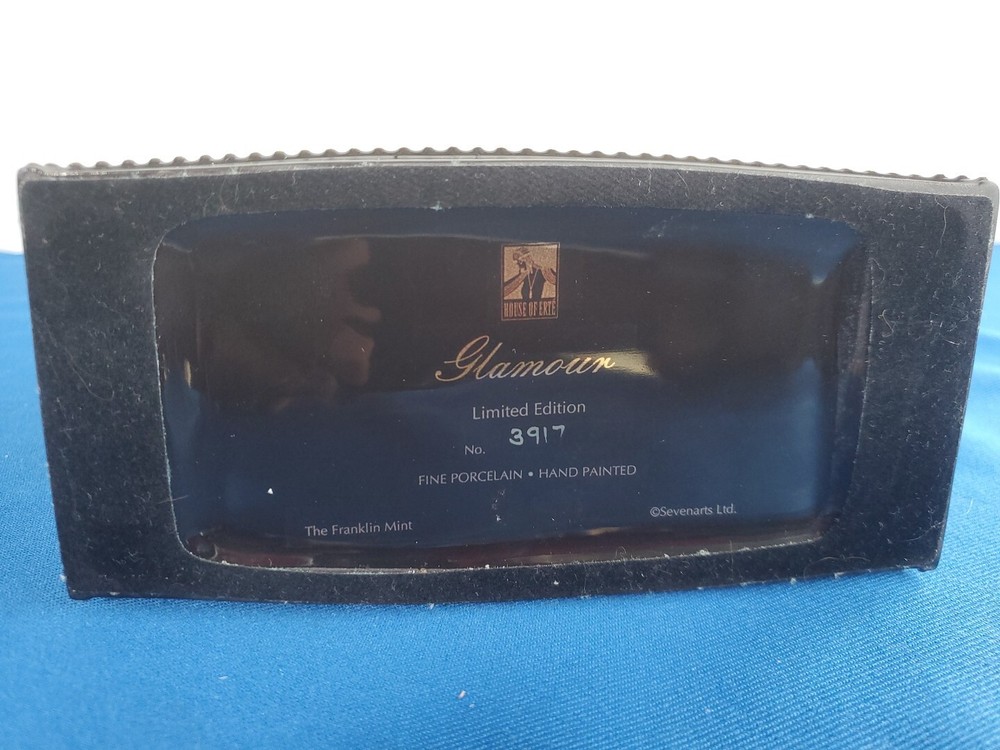The Franklin Mint Erte Limited Edition Art Deco Glamour Porcelain Lady Figurine is a stunning sculpture created by the renowned artist Erte. This limited edition piece embodies the Art Deco style with its elegant portrayal of a woman, showcasing intricate details and fine craftsmanship. Perfect for art enthusiasts and collectors, this sculpture captures the essence of glamour and sophistication in a timeless design.