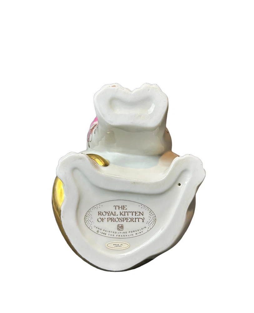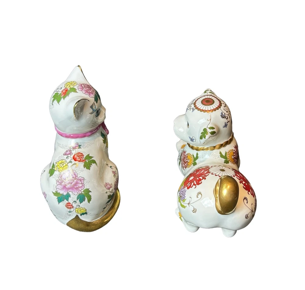 Adorable "Imperial Puppy of Satsuma" and " Royal Kitten of Prosperity" were designed by renowned artist Yuki Morioka for Franklin Mint in 1987 and 1988 respectively. They are made of fine porcelain and are hand decorated with 24K gold. The puppy is approximately 6" tall and 8" long. The kitten measures approximately 7 5/8" in height and is 5 1/4" wide. Free of chips or cracks. Some minor age related wear to gilt (please refer to photos).