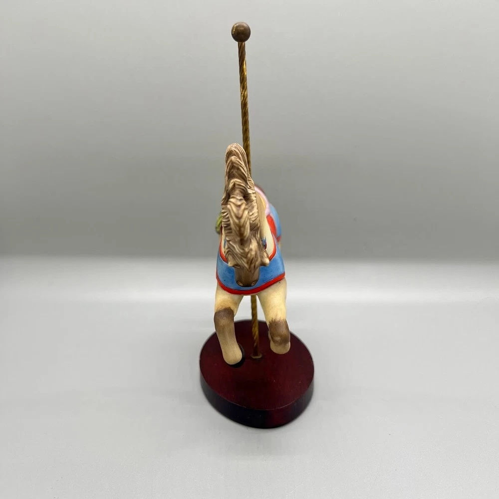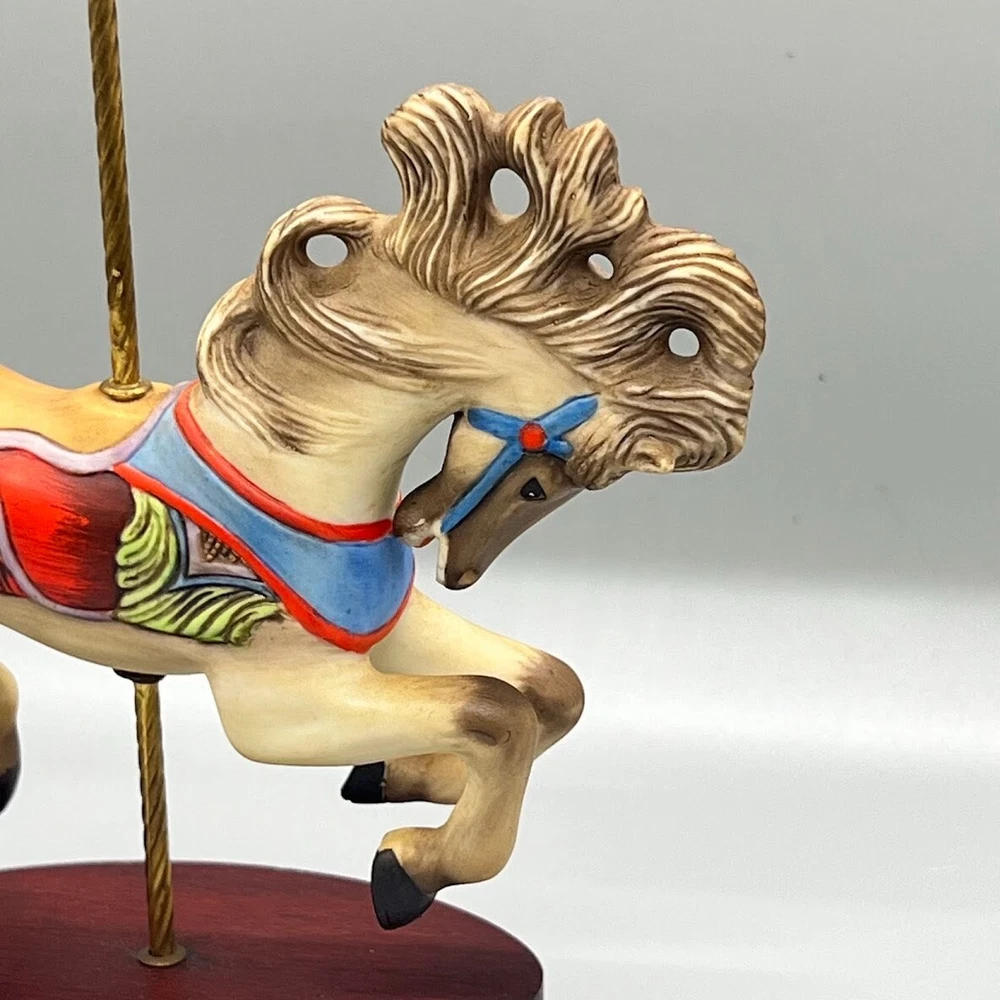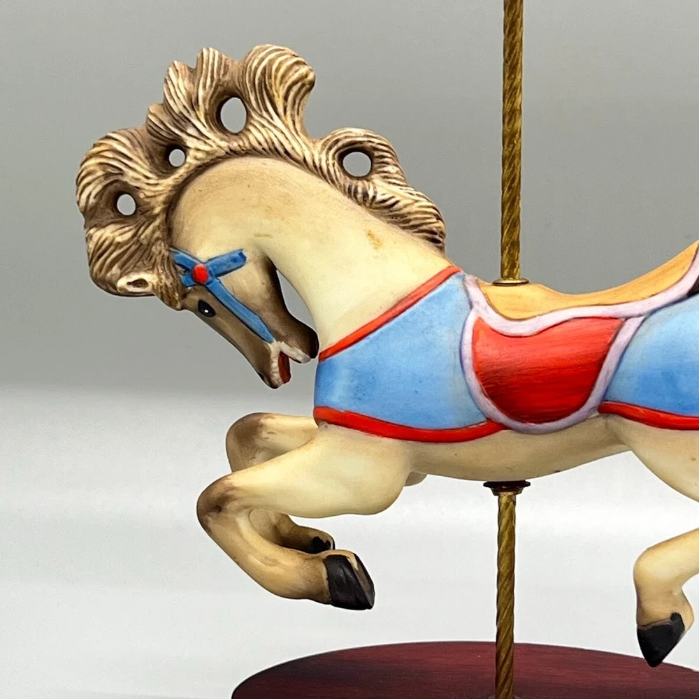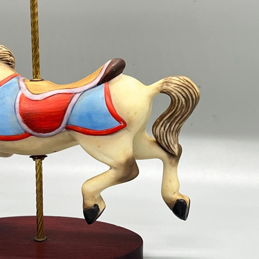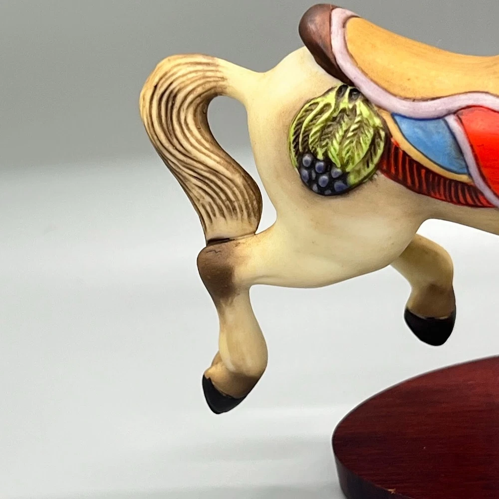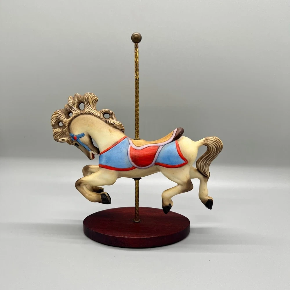 Franklin Mint Treasury of Carousel Art Horse Figurine 1988 Vintage Animal Figure Add a touch of elegance to your collection with this vintage Franklin Mint Treasury of Carousel Art Horse Figurine. This beautiful porcelain figurine features a stunning horse character from the famous Franklin Mint Treasury of Carousel. Crafted with care and hand-painted with precision, this original figurine is a retired piece from the 1988 collection. It comes unboxed and with a wooden base, making it easy to display in any setting. This Treasury of Carousel Art Horse Figurine is a must-have for any animal lover or collector. 6 3/8" Tall x 2 1/8" Wide x 5.5" Long Marked Made in Thailand 1988 FM