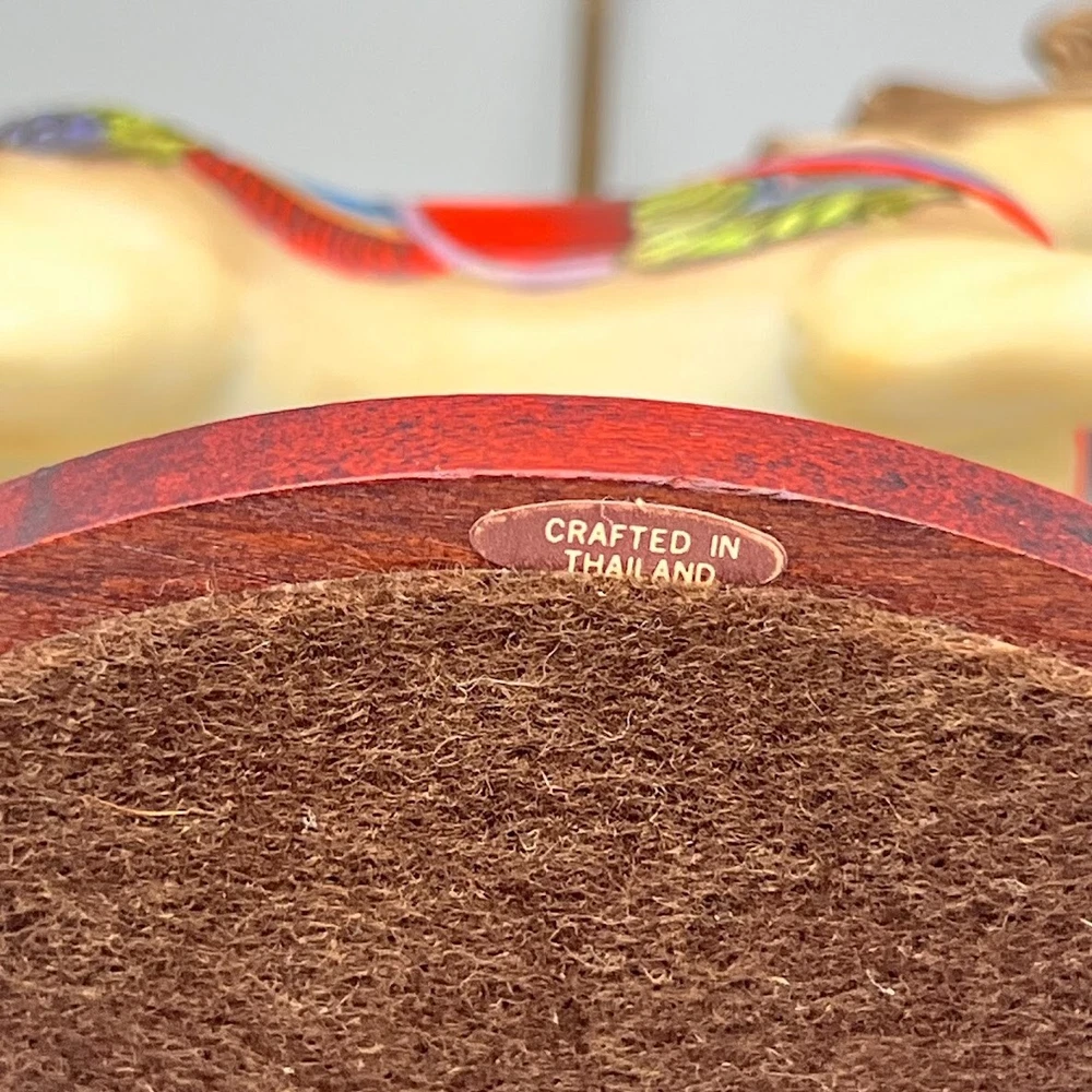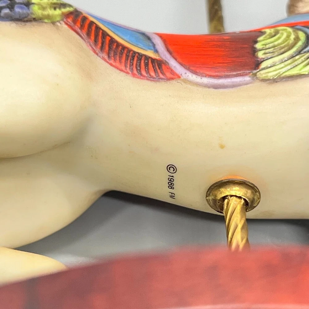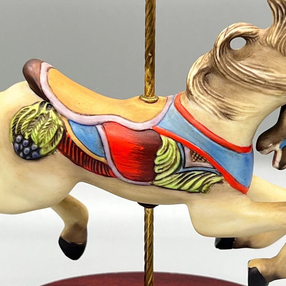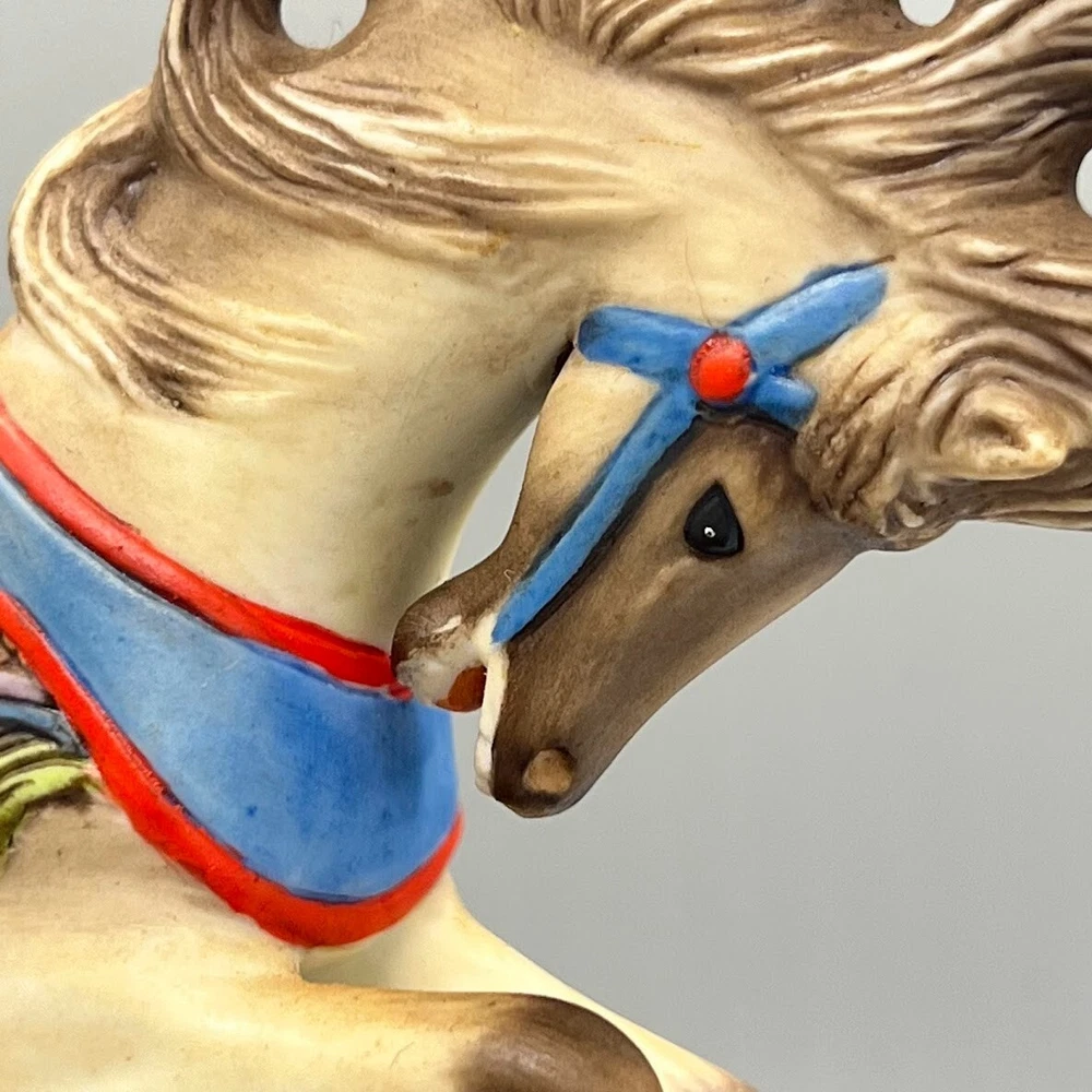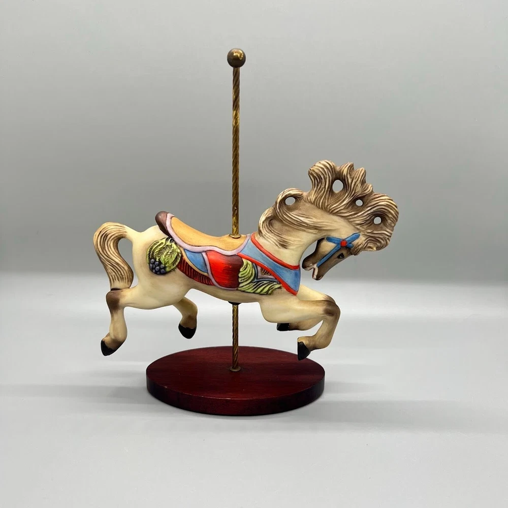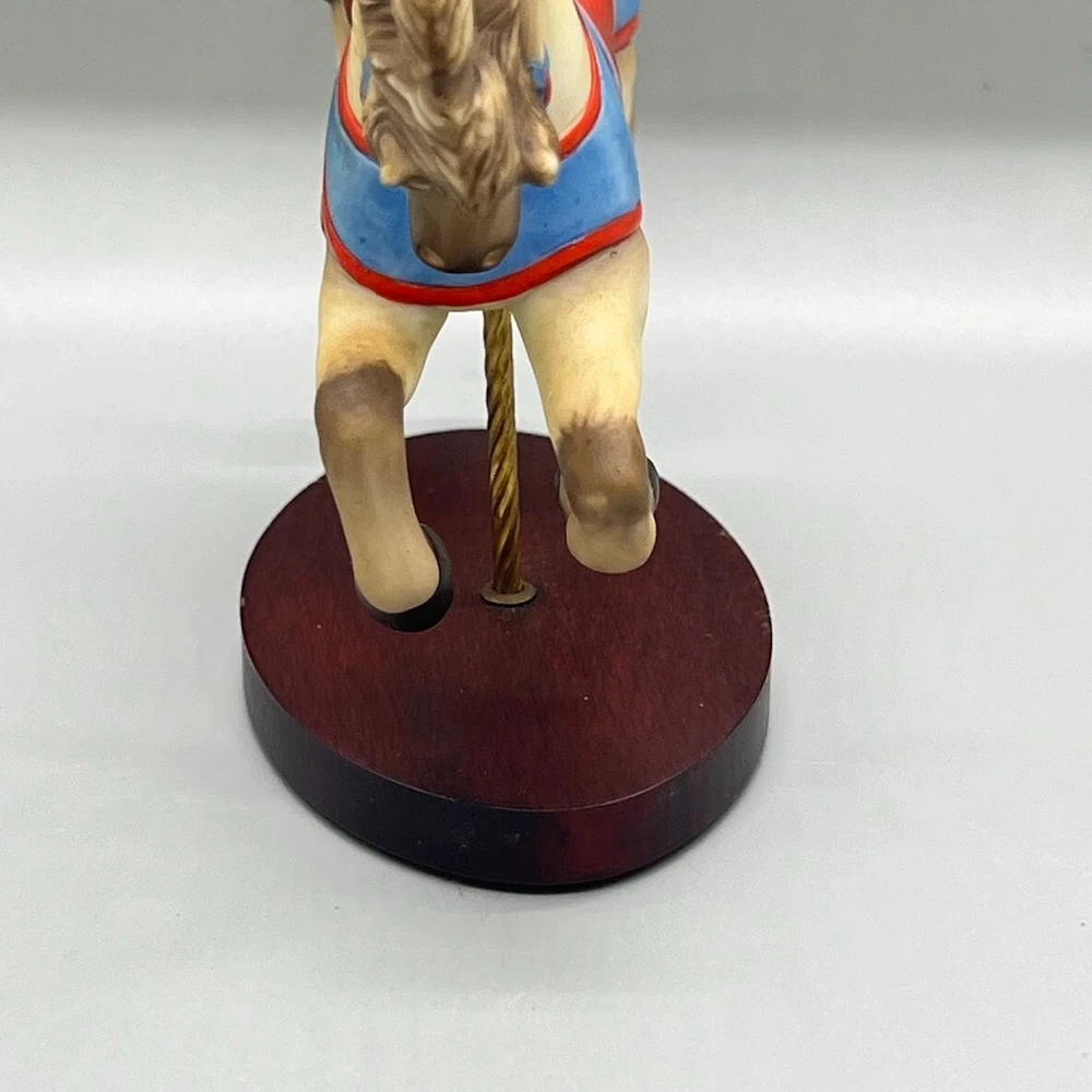 Franklin Mint Treasury of Carousel Art Horse Figurine 1988 Vintage Animal Figure Add a touch of elegance to your collection with this vintage Franklin Mint Treasury of Carousel Art Horse Figurine. This beautiful porcelain figurine features a stunning horse character from the famous Franklin Mint Treasury of Carousel. Crafted with care and hand-painted with precision, this original figurine is a retired piece from the 1988 collection. It comes unboxed and with a wooden base, making it easy to display in any setting. This Treasury of Carousel Art Horse Figurine is a must-have for any animal lover or collector. 6 3/8" Tall x 2 1/8" Wide x 5.5" Long Marked Made in Thailand 1988 FM