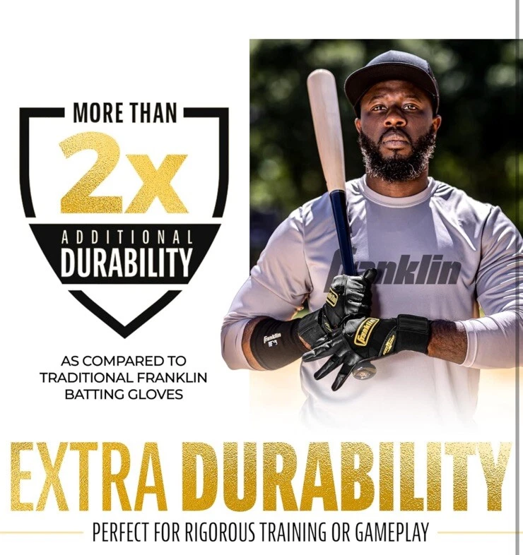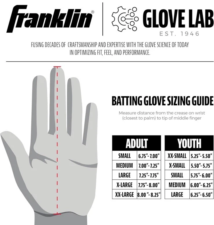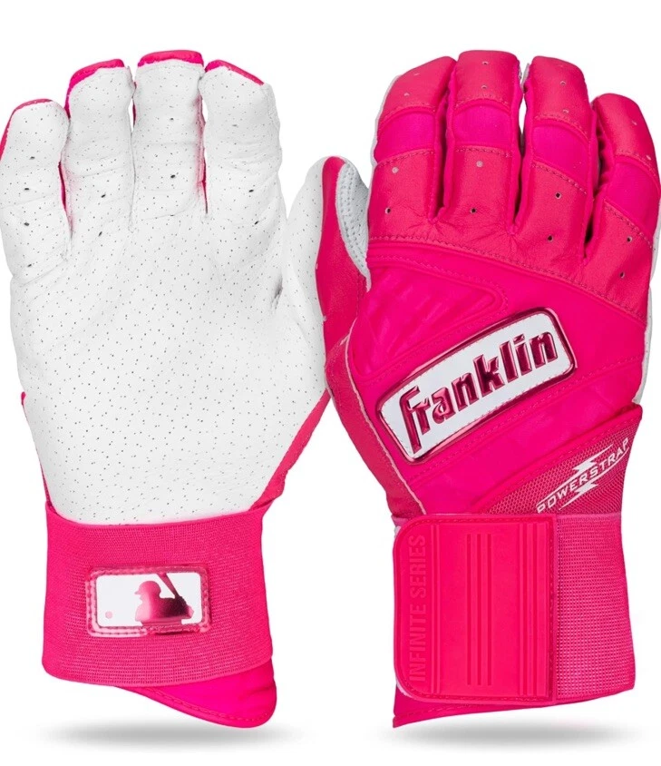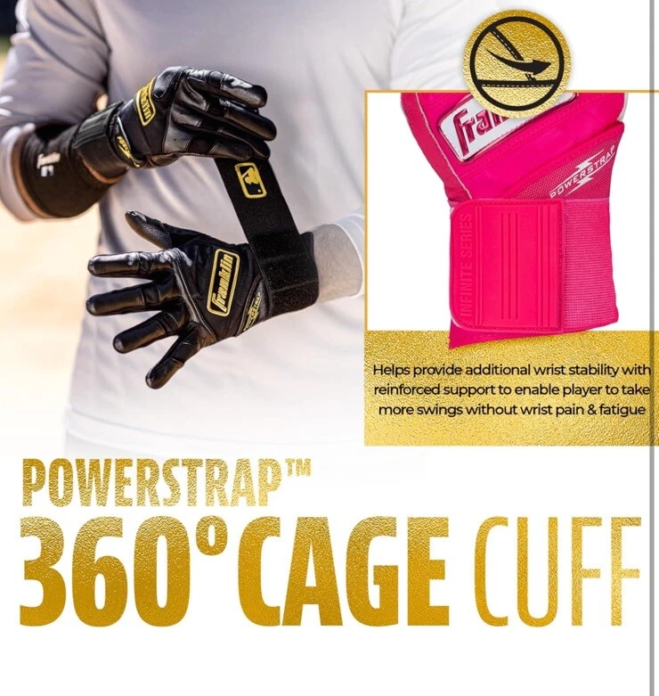 Description If you're looking for baseball and softball batting gloves designed for the optimal fusion of performance, durability and support, look no further than Franklin Sports' Powerstrap Infinite Series batting gloves. Crafted in tandem with our MLB pro players, the thicker leather maintains a superior softness without compromising the Franklin bat feel we all know and love. Designed for premium durability, the Powerstrap Infinite batting gloves are made to last swing after swing, and are perfect for use in the cages for batting practice or out on the field for games. Constructed with micro-perforations in the palm for added airflow to keep your hands cool and dry, and a seamless and patch-free palm design that provides a responsive feel on the bat with no bunching or seams in the way. Finished with our unique 60mm extra-tall wrist wrap and Powerstrap closure tab for reinforced wrist stability to provide the best support in the game. So if you're looking to practice your swing in the batting cages, or looking for additional grip and stability at the plate, grab yourself a pair of the new Powerstrap Infinite batting gloves from Franklin Sports today. Features & details PREMIUM LEATHER: Constructed with extra thick, premium leather for professional caliber toughness and durability that is built to last swing after swing 2X DURABILITY: These batting gloves are designed for double the durability of standard batting gloves so baseball and softball players can hit the batting cages day after day to perfect their swing with no bunching or tears BREATHABLE: Made with ultra-fine, micro-perforations in the palm to increase airflow and breathability to keep your hands cool and dry despite the rugged leather construction 360° CAGE CUFF: The ultra-thick 60mm wrist strap helps provide additional wrist stability with reinforced support to enable players to take more swings without wrist pain and fatigue DESIGNED BY PROS: The Powerstrap Infinite batting gloves were designed with the input of the Franklin Sports MLB pro roster to create a pair of batting gloves designed to withstand the rigors of batting practice and gameplay with premium level performance