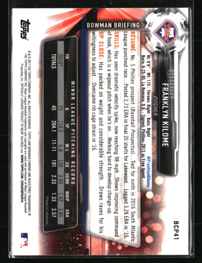 Team: Philadelphia Phillies Player/Athlete: Franklyn Kilome Sport: Baseball Set: Bowman Card Number: BP41 Autographed: No League: MLB Features: SN150 Manufacturer: Bowman Season: 2017 Year Manufactured: 2017 Type: Sports Trading Card Parallel/Variety: Prospects Blue Graded: No