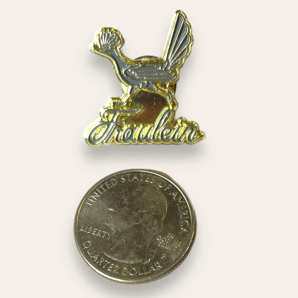 Fraulein Roadrunner Lapel Tie Tack Hat Pin Gold Tone Bird Unsigned Upgrade your accessories game with this stunning Vintage Fraulein Roadrunner hat pin. The intricate design and gold tone add a touch of whimsy to any outfit. A must-have for bird lovers and vintage enthusiasts. The pin is in good vintage condition and ready to wear. This is from an estate sale and is unbranded and unsigned.