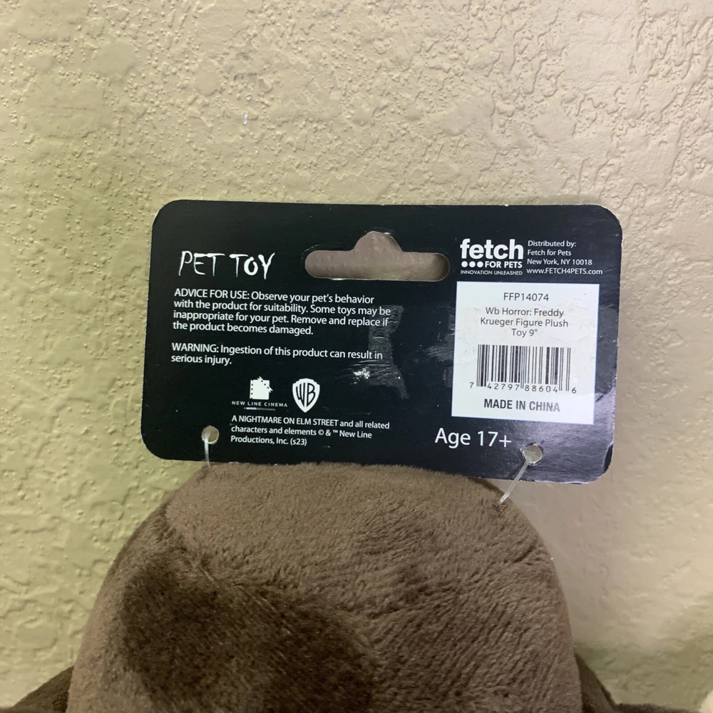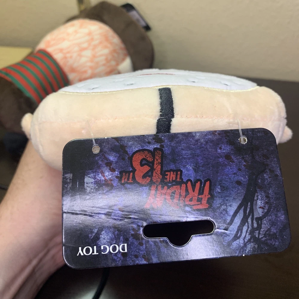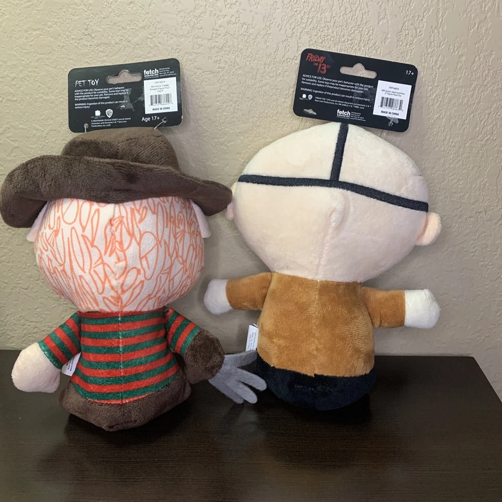 Freddy Krueger & Jason Vorhees 9" plush pet toys, new with tags, Fetch for Pets Not sure what the thinking is behind these, but to make these as pet toys and not as plush for humans is just insane to me. Jason is the only one that squeaks when you press his belly. Would have been better if Jason was carrying a machete, but they are adorable nonetheless. They are approximately 9" long, 6" wide, and 3.5" thick. Slight damage to the back of the Freddy doll's tag, but nothing major. Find it hilarious that they are labeled as 17+ as a pet toy. Please make sure your pet is age 17 or older before purchasing.
