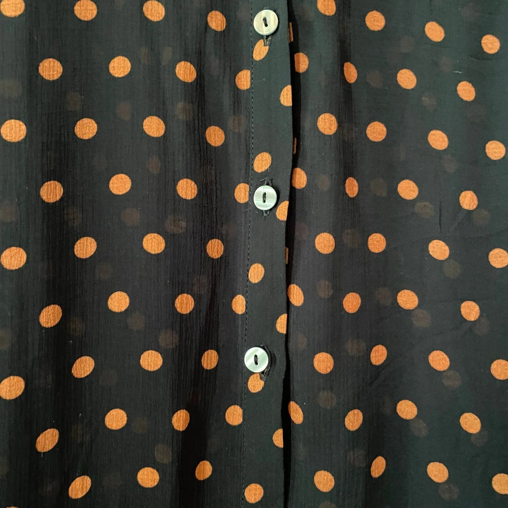 Free People Women's size Small Ciara Black Orange Polka Dot Blouse Lightweight Transparent. Free People brand women's blouse in a size small. Black colorway with orange polka dots. Flowy, lightweight material. Measurements as pictured. In great pre-owned condition, see photos for more details. Always feel free to ask any questions you may have! Reasonable offers accepted.