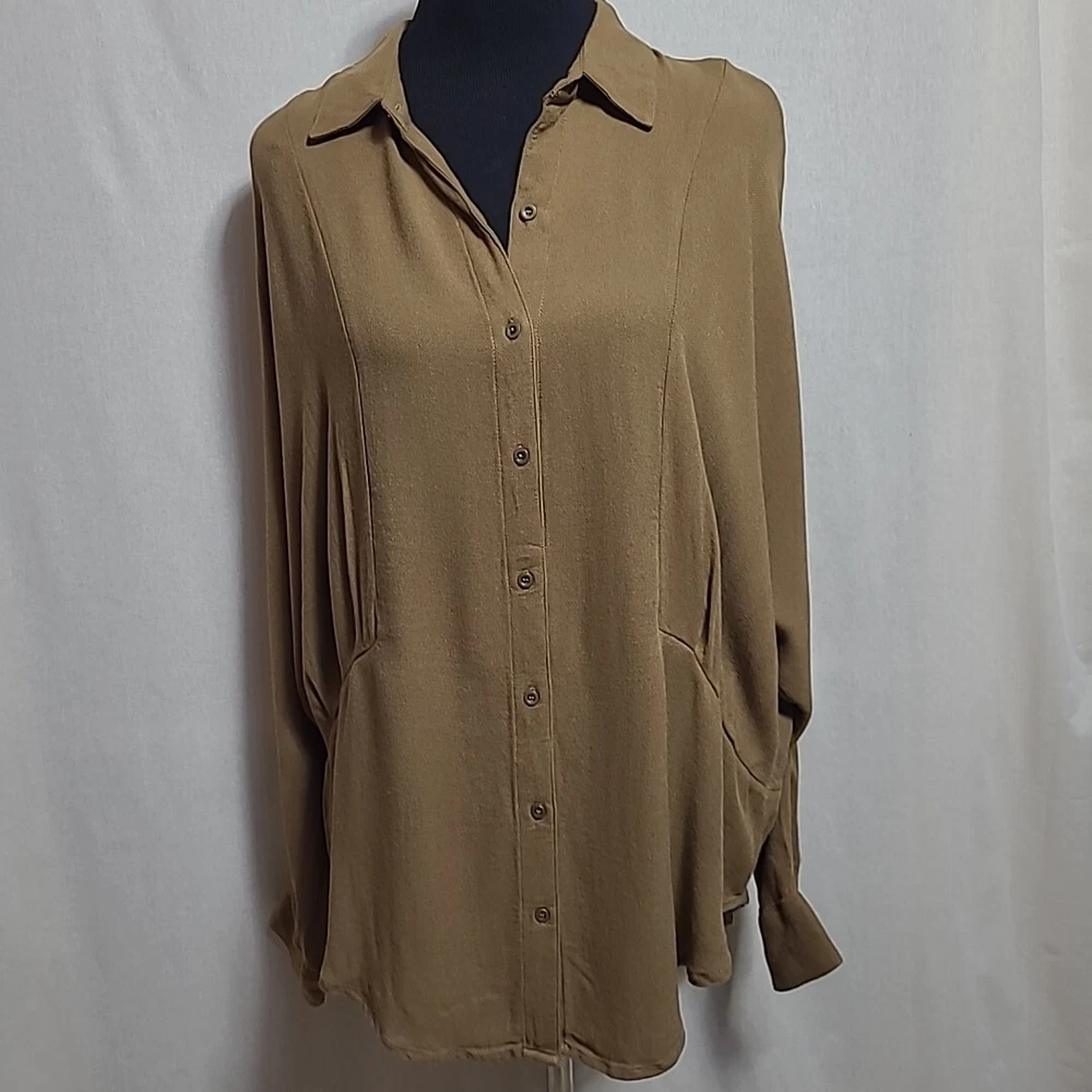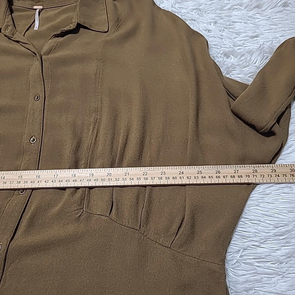 Free People Long Sleeve Drop Shoulder Top Size Medium Button Front Green Excellent Pre-Owned Condition. No rips, stains, or holes. See pictures for complete condition details and measurements. 100% Rayon Chest: 58 Inches Waist: 46 Inches Length: 30 Inches All items are sanitized according to platform policy.