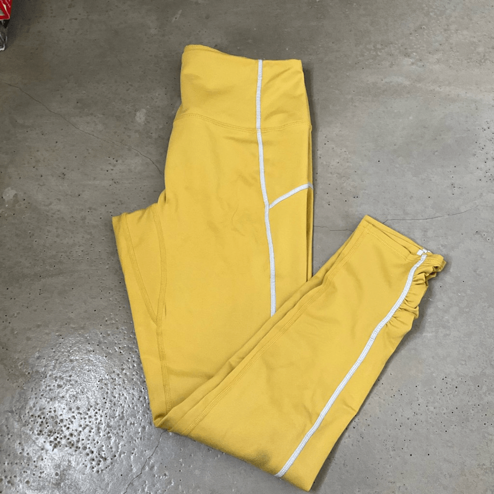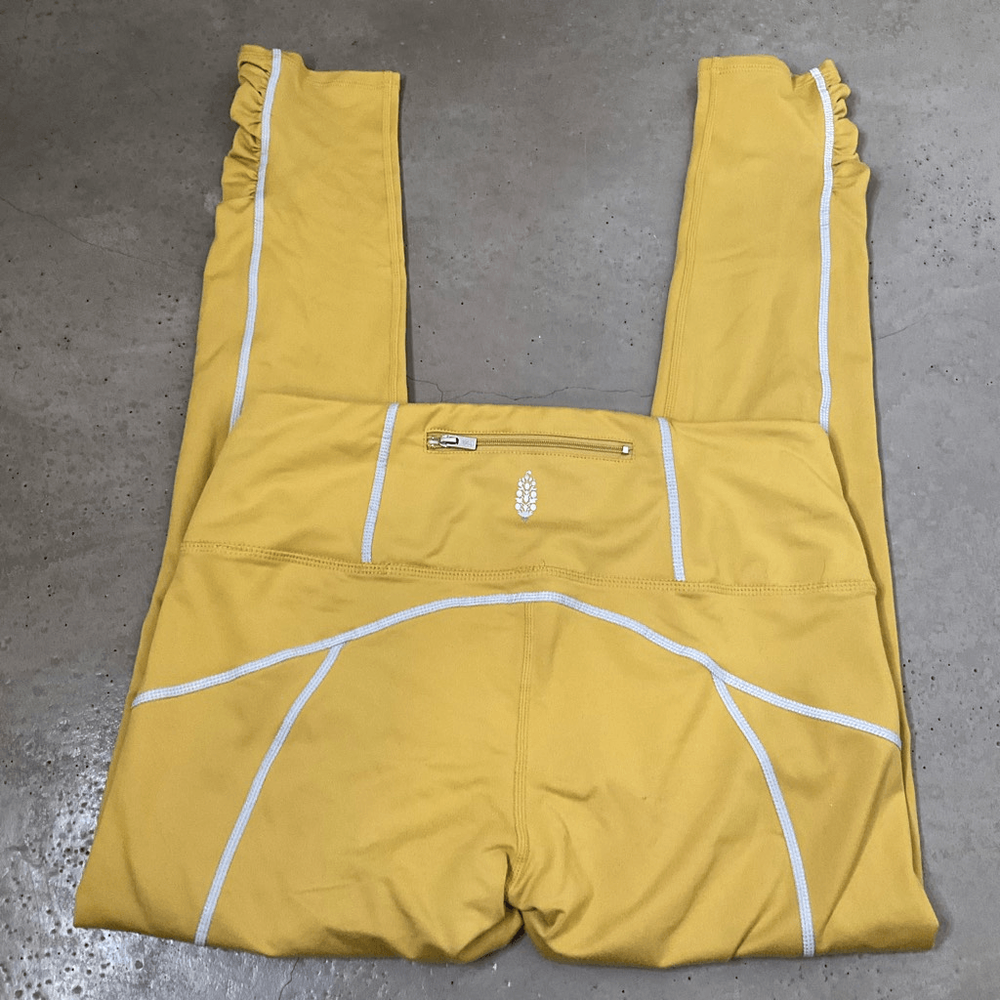 Free People Movement You’re A Peach Leggings Perfect for anything from a nighttime run to your morning yoga class, these squat-proof leggings are both flattering and functional. The fit: High-rise waist, ⅞ cropped ankle The fabric: Sweat-wicking; ultra-compressive; reinforced waistband The features: Squat-proof, figure-flattering reflective trim, ruched ankles Best for: Your sweatiest HIIT workouts in the gym or outdoors Zipper pocket Knees show wear, see photo Color: Yellow Size: Medium Fair Condition