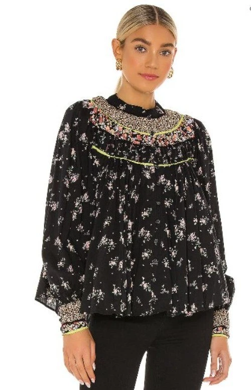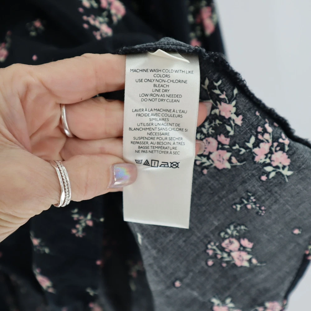Free People Paloma Blouse Women's M Black Witchy Gypsy Prairie Bohemian Cottage If this blouse had a personality, it would be your quirky aunt who reads tarot cards and always smells like lavender. With its bohemian flair and contrast trims, it's like wearing a garden party on your torso—a party where the floral prints are the guests of honor. • Long sleeves with button cuffs • Contrast trim detailing • Floral print • Button-down front • Flowy silhouette Features: • witchy, gypsy, prairie, dark cottage, grannycore, bohemian, boho, flowy, hi low hem Size: Womens M Condition: Pre-Owned Good Has a small hole near a button, as seen in photo. Can be mended.