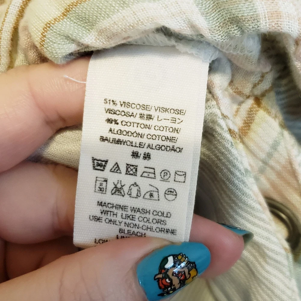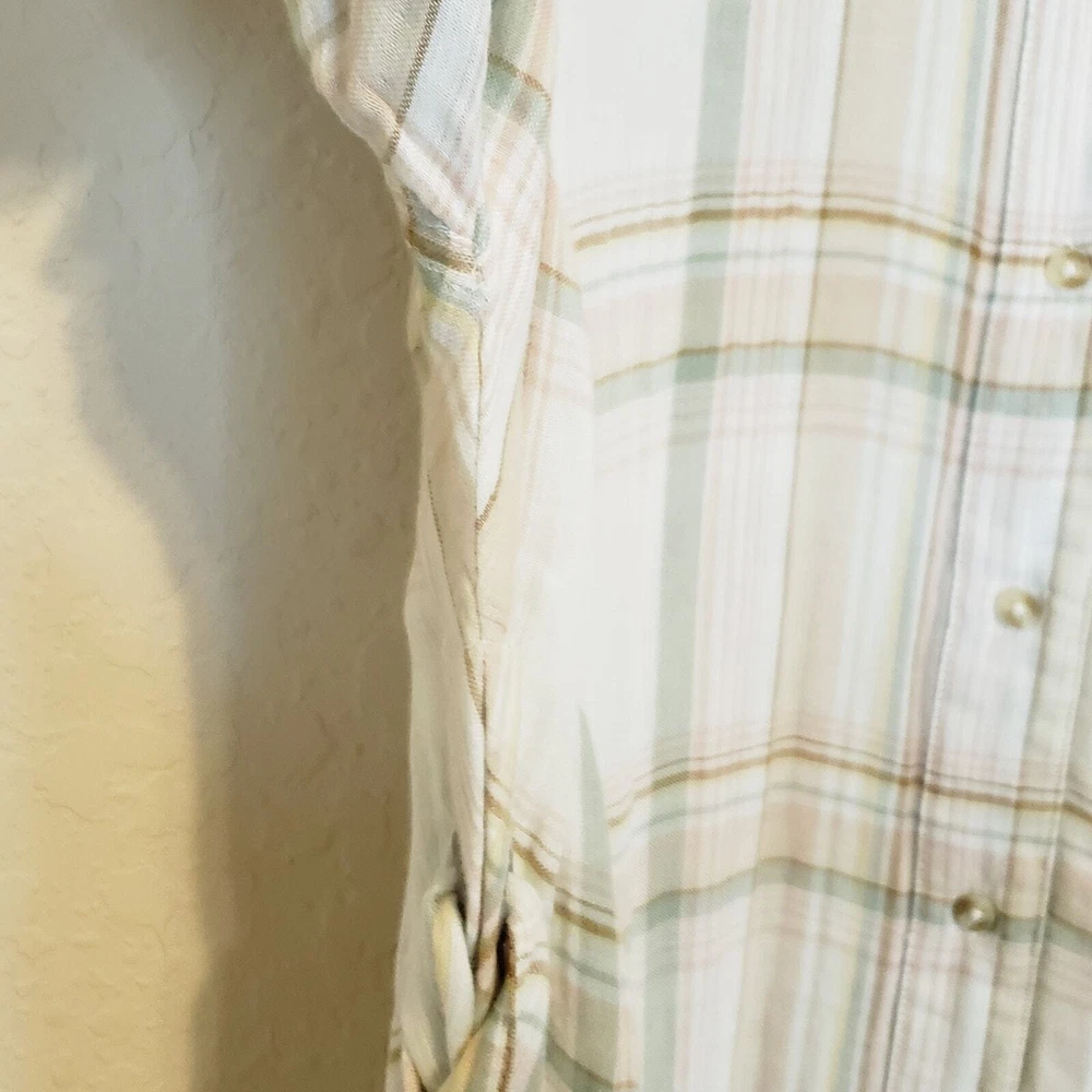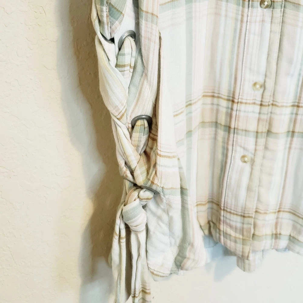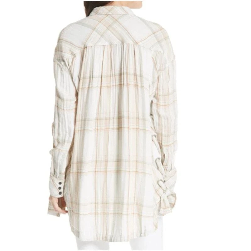 Free People Pastel Plaid Nordic Day Button Front Tunic Top Not your average plaid button-down, this one is styled with a high/low hem and trendy lace-up sides that add fun detail without losing the laid-back feel. Front button closure Point collar Long sleeves with button cuffs Back yoke Lined 51% viscose, 49% cotton Machine wash, line dry Size S Small Approximate Measurements: pit to pit - 22" across length - 31" Excellent pre-owned condition, no rips, tears or stains. Smoke free, dog friendly home. casual everyday comfort plaid flowy soft girl aesthetic pastels fall autumn spring transitional