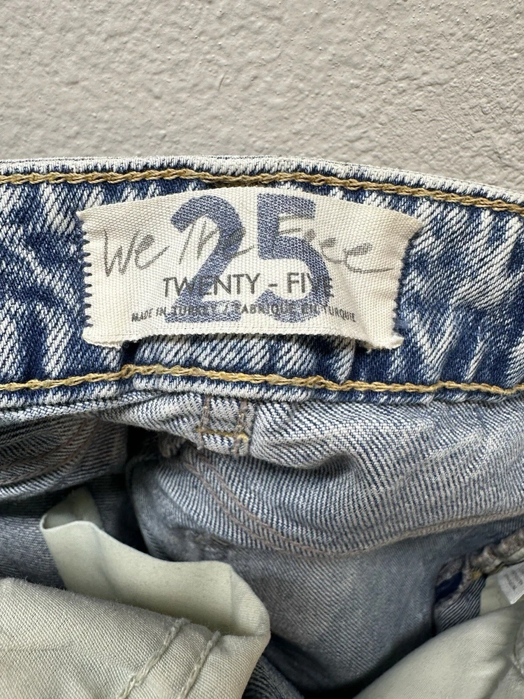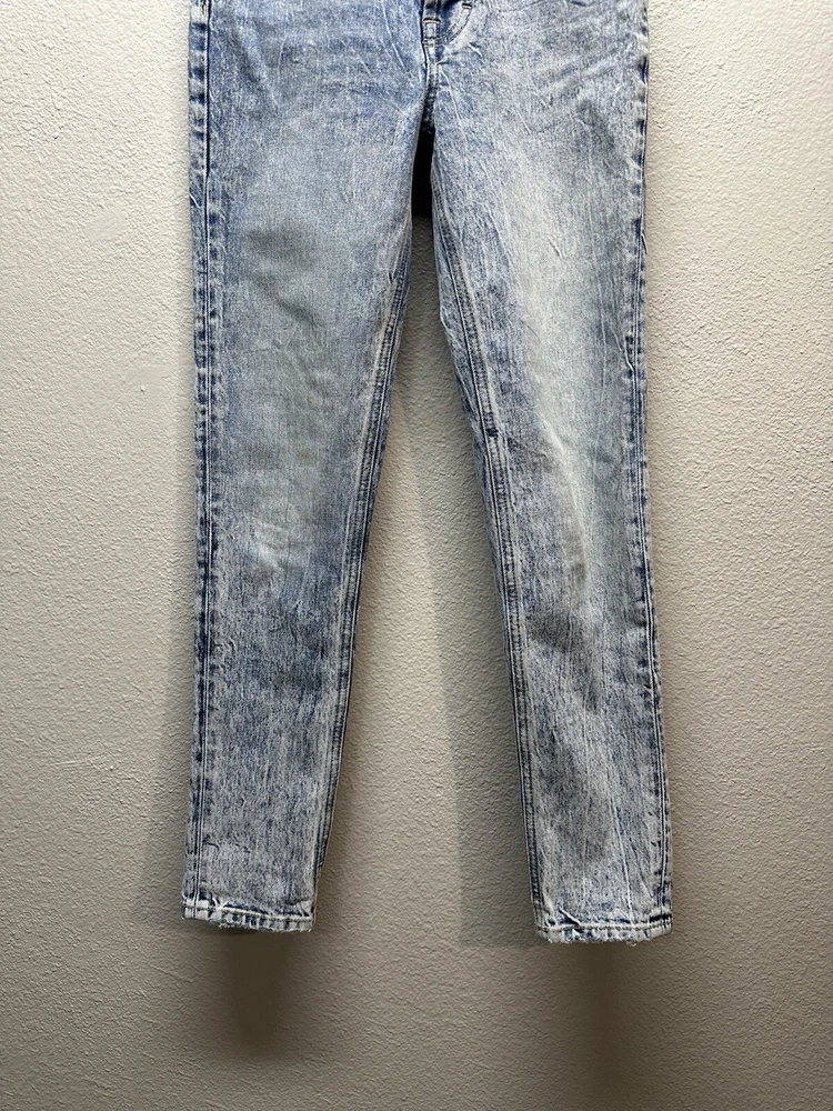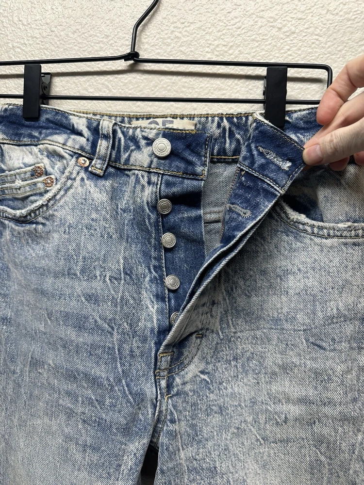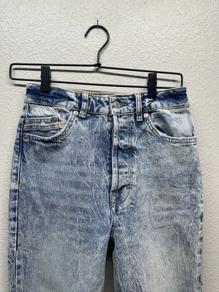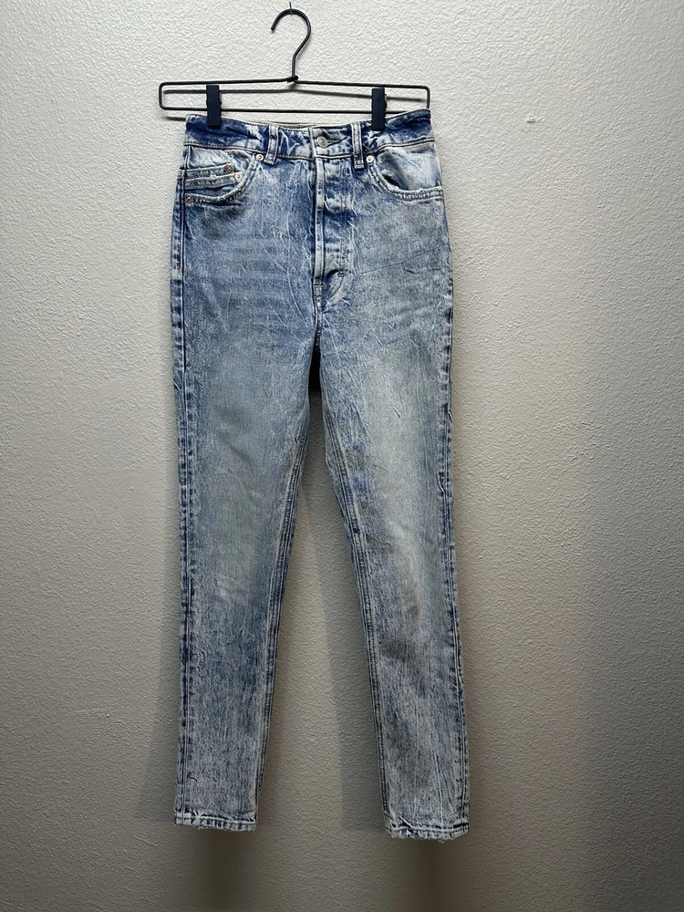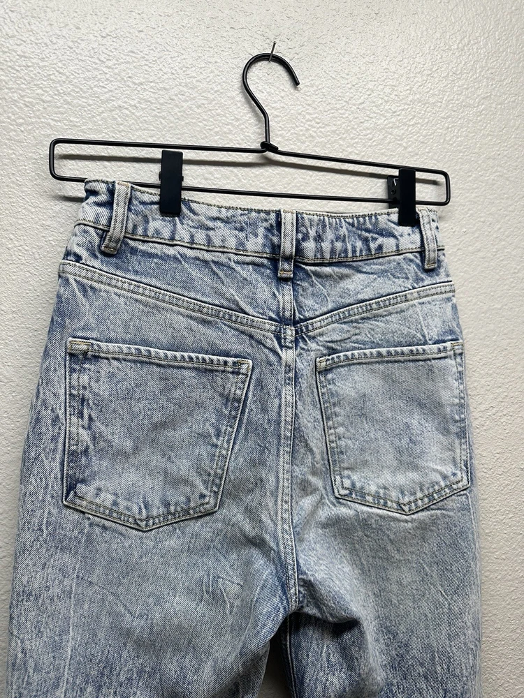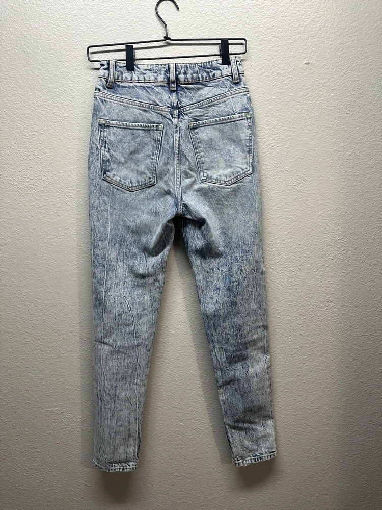 Free People X Zuri Ultra High Waist Ankle Mom Jeans in size 25, featuring an acid wash blue denim fabric with distressed accents and a button closure. This grunge and bohemian-inspired style has a slimming fit, regular rise, and is made of a blend of spandex and cotton. Perfect for a 90s-inspired look with a touch of modern flair.