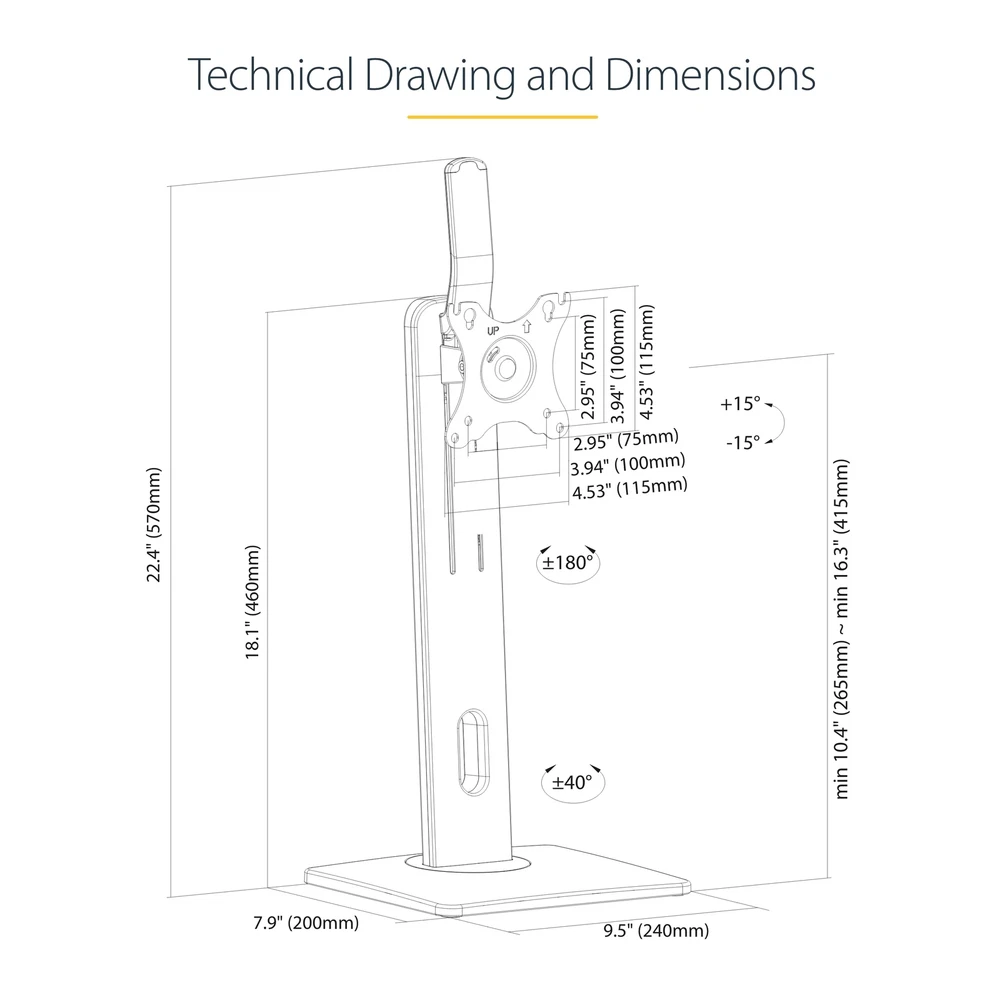 FREE-STANDING SINGLE MONITOR MOUNT SUPPORTS A DISPLAY UP TO 32 INCH (15LB); VESA FREE-STANDING SINGLE MONITOR MOUNT : This monitor stand supports a VESA display up to 32" (15.4lb / 7kg); VESA 75x75/100x100mm; Solid rotating base (+/-40°); coated semi-gloss black finish offers a professional and modern look RANGE OF MOTION: Ergonomic monitor mount increases comfort & productivity with +/-15° tilt, +/-180° screen rotation (portrait/landscape); Entire column swivels +/-40° -TOUCH ADJUSTMENT: Universal monitor stand with height adjustable range of 10.4" to 16.3" (265mm to 415mm) from the desk; The spring-assisted LCD monitor stand offers height adjustments by hand using the easy-access lever at the top of the stand STABLE & NON-SLIP: Freestanding computer monitor mount w/ sturdy anti-slip base (7.8"x9.4" / 200mm x 240mm) and small footprint for maximum stability & flexible placement; Also ideal for glass top desks or surfaces where monitor mounts cannot be installed EASY INSTALL: Keyhole pattern allows you to easily hook and mount your desktop/PC monitor for a faster install; Built-in cable management slot in the lower portion of the column for a tidy workspace; Anti-slip rubber pads prevent scratches on desk surface