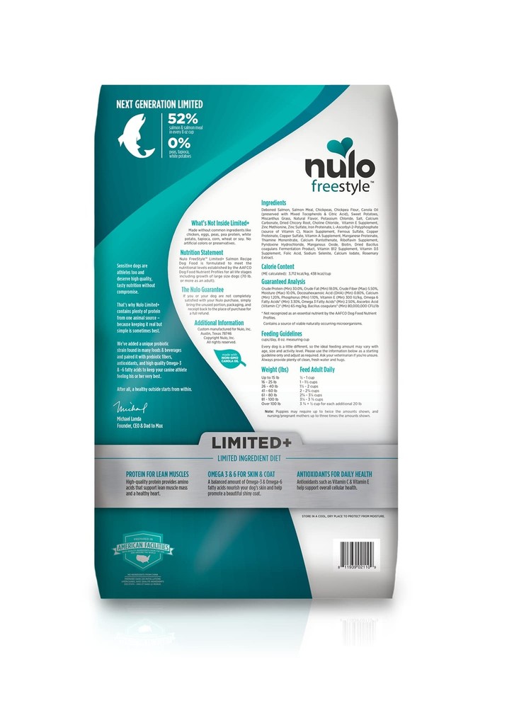 Limited Ingredient Dog Food – FreeStyle Limited+ Salmon Recipe is a grain-free, single-protein dog food designed for dogs with food sensitivities. Crafted with real salmon and no chicken, eggs, or artificial additives. High-Protein Limited Ingredient Diet - With 30% crude protein, this single animal protein dry dog food with taurine supports lean muscles, energy, and heart . A simplified recipe with no peas, grains, or potatoes gives your dog nutrient-dense, limited-ingredient nutrition. Probiotic Dog Food for Digestion – limited ingredient salmon dog food features advanced probiotics and natural fiber to support healthy digestion, gut , and immune function. Our limited natural dog food recipes give adult dogs and puppies nutrition they deserve. Omegas & Antioxidants for Skin & Coat - Formulated with & -6 fatty acids, this natural dog food helps support healthy skin and coat. Antioxidants like vitamins C & E promote overall cellular with nutrition for puppy & adult dogs. Free from Fillers – Natural dry dog food without common allergen ingredients. No chicken, eggs, grains, corn, wheat, soy, peas, white potatoes, or tapioca ingredients. A simplified, high-protein diet for dogs and active puppies. Made in the USA with the finest ingredients from around the world.