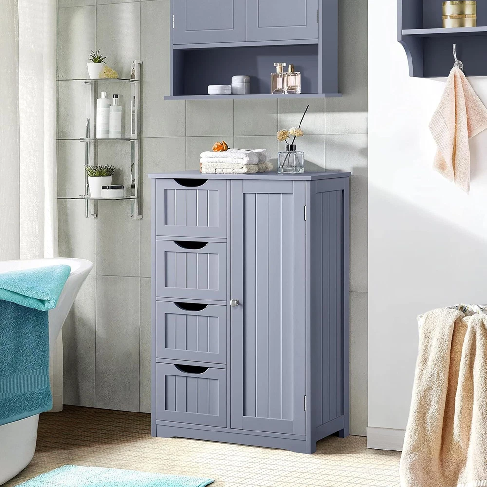 Product Description Wooden Bathroom Cabinet 4 Drawers & Cupboard Bathroom Storage Unit Hallway/Floor Cabinet Gray If extra toiletries and spare towels are piled up in your bathroom ensemble, having a spacious storage cabinet can help you hide all the clutter behind the door and out of sight. This 22” L x 12” W x 32’’ H cabinet has 4 no-handle sliding drawers and 1 roomy cupboard with an adjustable shelf. Once you have it, the storage space in your bathroom, sitting room will be instantly expanded. Its clean-lined design with slatted paneling works well in a variety of aesthetics. Specifications: Material: P2 MDF Overall dimension: 22 x 12 x 32.5'' (LxWxH) Drawer interior size:8.8 x 9.6 x 3.9'' (LxWxH) Shelf size: 10 x 10.1'' (WxL) Adjustable distance between shelves: 6.3''; 8.9''; 11.3'' G.W.: 40.8 lb Color: Gray Bullet Point Sturdy construction Ideal space saver Adjustable shelf height Waterproof surface Safety is priority All-matching design Easy to assemble Product Details Adjustable shelf height Three easy-to-set shelf heights for your different storage needs. Heavy-duty Metal Knobs Vintage metal knobs for good durability and texture. Added Safety Anti-toppling fitting can secure the cabinet to the wall for dual safety. P2 MDF High quality material for you and long-term use. Multi-scenario application Storage Cabinet Bathroom Floor Cabinet Hallway Floor Cabinet Bathroom Floor Cabinet with 2 Doors and 2 Shelves Bathroom Floor Cabinet with 4 Drawers and 1 Cupboard Bathrroom Floor Cabinet with 4 Drawers Bathroom Floor Cabinet with Multiple Tiers Shelves 2-Tier Console Table Add to Cart Add to Cart Add to Cart Add to Cart Add to Cart Customer Reviews 4.5 out of 5 stars 1,312 4.4 out of 5 stars 7,699 4.5 out of 5 stars 2,203 4.6 out of 5 stars 2,911 4.7 out of 5 stars 3,951 Price $69.99 $ 69 . 99 $94.99 $ 94 . 99 $69.59 $ 69 . 59 $76.99 $ 76 . 99 $52.79 $ 52 . 79 Color Grey Grey Grey Grey Grey Materials MDF MDF MDF MDF MDF Overall Dimensions 24 × 12 × 32 inch 26 × 14 × 35.5 inch 12 × 12 × 32.5 inch 22 × 12 × 34 inch 40 x 11.8 x 32 inch Max Weight Capacity Tabletop: 33 lb Each Shelf: 26.5 lb Bottom Board: 26.5 lb Tabletop: 7.2 lb Drawer: 8.8 lb Shelf: 22 lb Tabletop: 19.8 lb Each Drawer: 7.7 lb Tabletop: 51 lb Open Shelf: 22 lb Drawer: 6 lb Movable Shelf: 18 lb Tabletop: 79.4 Pound Shelf:57.3lb s