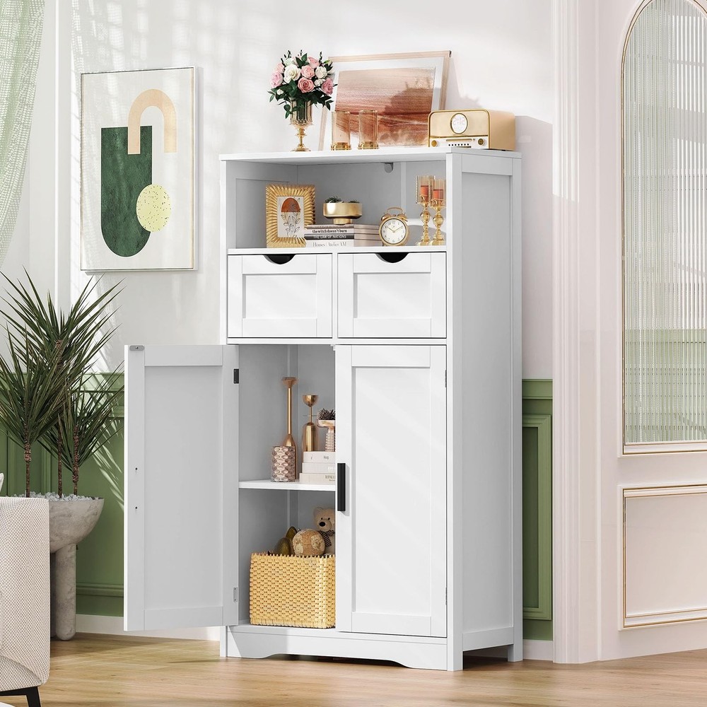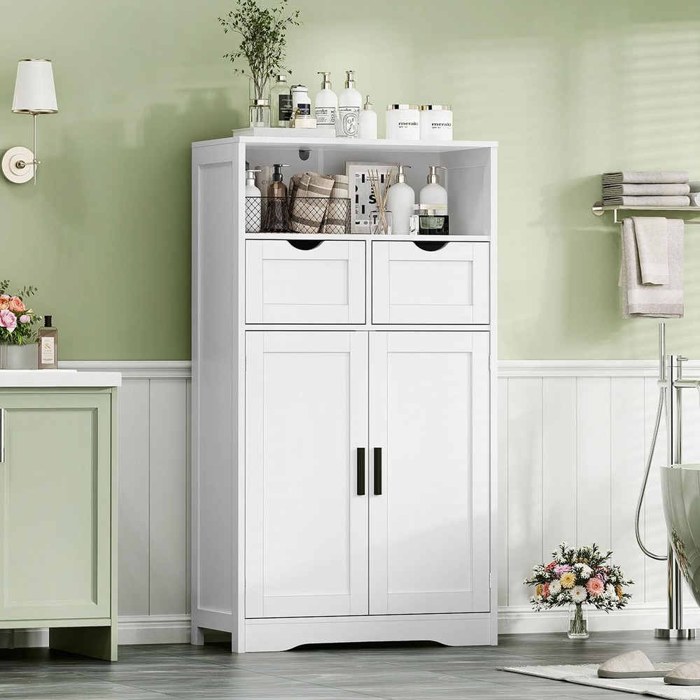 This bathroom cabinet is a game-changer for small spaces! The combination of drawers, shelves, and cabinets provides versatile storage for everything from toiletries to towels. I love how the adjustable shelf lets me customize the interior to fit taller bottles. Assembly was straightforward, and the clean white finish matches any decor. It's sturdy enough to hold all my bathroom essentials while keeping everything organized and within easy reach. The compact footprint fits perfectly in my tight bathroom space without feeling cramped. After using it for weeks, I can confidently say it's one of the most functional storage solutions I've bought—no more cluttered counters!