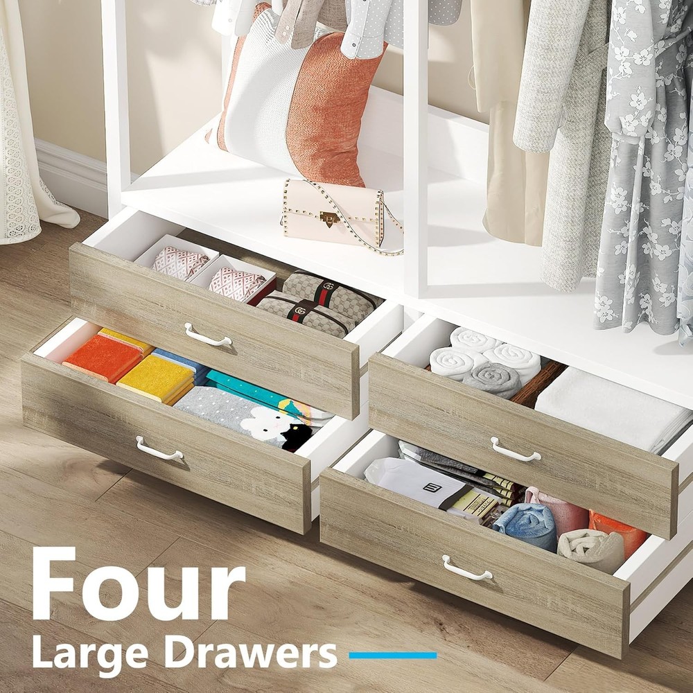 Color White Walnut Assembly Required Yes Item dimensions L x W x H 16 x 47 x 71 inches Product Care Instructions Wipe with Dry Cloth GOOGBYE CHAOS: This closet rack with drawers offers spacious space with different functional areas for your clothing and stuff. This garment rack has a 47’’ rod for hanging clothes. The top and bottom shelves, 4 drawers, and 8 hooks are perfect for holding suitcases, baskets, shoes, and bags in good order. UNIQUE 4-DRAWER DESIGN: The open wardrobe closet has 4 spacious drawers for concealed storage. Drawers design means the full storage potential in the same storage space. You can pile up the dumping things but still look tidy after you close the catch-all drawers. STRONG BEARING CAPACITY: This heavy-duty closet organizer has a premium thickened metal frame. The wardrobe rack provides superb stability even holding tons of clothes and accessories. The safety is guaranteed with the anti-tip straps if you have kids who might use it as a climbing frame. RETRO INDUSTRIAL STYLE: The rustic wood of the clothes garment rack will warm up your space and the metal pipe design adds an industrial edge. This industrial-style clothing rack with shelves offers a retro charm effortlessly into any decor.