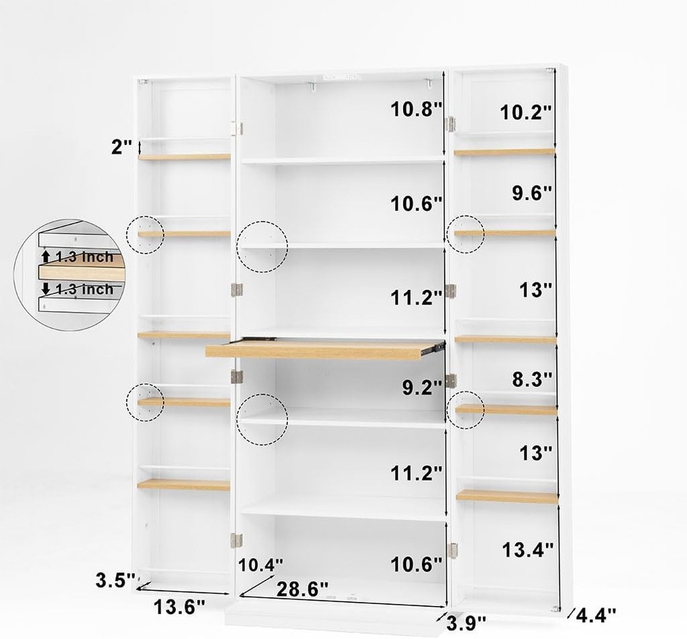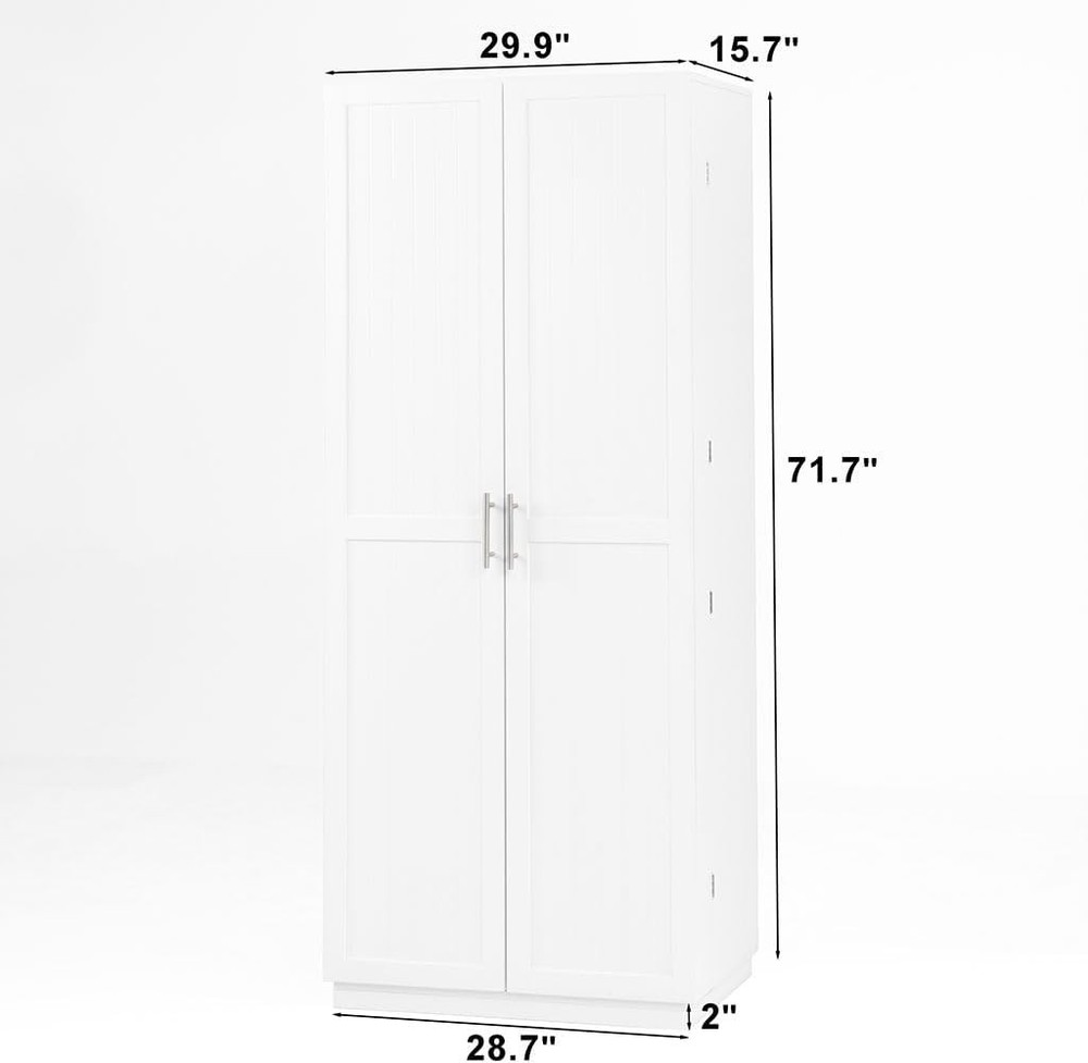 Product Description About this item • GENEROUS STORAGE CAPACITY: Boasting an upgraded large size (29.9"W x 15.74"D x 71.65"H), this cabinet offers ample space to organize kitchen essentials, from tableware to snacks, making it ideal for kitchens, living rooms, and more. • CUSTOMIZABLE INTERIOR: Equipped with three height-adjustable shelves, the pantry allows you to create a tailored storage solution for items of varying sizes, ensuring optimal organization and easy access. • CONVENIENT RETRACTABLE PANELS: Enjoy added functionality with built-in retractable panels inside the cabinet, providing temporary surface space for placing items while cooking or organizing. • DURABLE AND SAFE CONSTRUCTION: Crafted from high-quality MDF with an elegant smooth finish, this freestanding cabinet is not only visually appealing but also built to last. The widened, weighted base and anti-tipping device ensure stability and safety. • VERSATILE SPACE-SAVING DESIGN: This pantry cabinet's space-saving design makes it a practical storage solution for various settings, including homes and offices, offering both functionality and a touch of elegance. Specification Main Color: White Main Material: MDF Product Dimensions:29.9"×15.74"×71.65" Product Weight:119.5lbs Package Size:74"×17.1"×7.48" Weight:128lbs On Aug 10, 2025 at 23:06:32 PDT, seller added the following information: