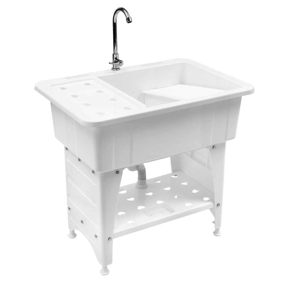 White Utility Sink Laundry Tub Freestanding Sink Wash Station w/ Faucet Home Description Made of high-quality PP, this laundry sink is sturdy and durable, with strong load-bearing capacity and stability. The versatile white color appearance and smooth lines can fit well with various home decor styles. The non-drilling and hand-screwing design makes installation easier, and its large sink size provides you with enough cleaning space. With this product, you can do laundry while standing, avoiding the strain of bending over for long periods. Key Features Selected Material: The premium PP with the injection molding process makes this product environmentally friendly, rustproof, and acid and alkali-resistant , ensuring a long service life. Ergonomic Design: The 29.92" overall height(not including the faucet) reduces the frequency of bending and the burden on your waist. The water-stopping edge around the sink prevents water from splashing onto the floor and keeps the floor dry to avoid slipping. High Stability: Thickened material(thickness: 2.8mm), four supporting lage, stable rectangular structure, strong screw fixation, and reinforcing rib make its weight capacity up to 220.46 lbs, and the 1.18in adjustable feet on the bottom of the sink can adapt well to uneven ground, making the product more stable and safer to use. Large Size: The large sink size (32.28*22.44*9.84 in) allows you to clean large amounts of clothes and wash pet cats and dogs inside. Its large capacity (29.06gal) makes it a convenient water storage sink when plugging the drain stopper. Effortless Installation: Its simple structure, standard threaded connector, convenient wing nuts, and complete installation accessories allow you to easily complete the installation in a short time without additional tools. Washing Assistant: A 360° rotatable high faucet (height: 13.39 in) with a comfortable handle allows you to easily adjust the water flow, and achieve dead-end cleaning. In addition, a removable washboard and a drain board can adapt to your different needs, and the surface of the washboard is designed with an inverted triangle to better remove stains. The bottom of the sink is designed with a concave center to drain water quickly. Hollow-out Design: The lower shelf and the drain board are multiple hollows, helping quickly filter the residual water on the washing items, so it is not easy to breed bacteria . Easy to Clean: Due to the smooth surface, simple structure, and open design, you can easily wipe off the dirt on it with a soft cloth. Ideal Gift: This product is stylish and high-quality and can be used as an ideal housewarming, birthday, and holiday gift for parents, friends, and loved ones. Good Customer Service: We stand behind all our guests and look forward to assisting you with your purchase. It is our pleasure to answer your confusion and questions. The end of the story between us is not "we sell and you buy". Details Soap Grooves: Three soap grooves with holes can help place the soap and dry it, providing convenience for washing clothes. Stretchable Drain Pipe: It can be bent into the desired shape according to the installation needs, which is convenient for drainage. Raised Bottom: It facilitates cleaning but also increases the storage space. Smooth Edges: The rounded and smooth edges not only add to the aesthetics of the product but also improve the safety of use. Application It is suitable for cleaning clothes, pets, pots and pans, fruits, vegetables, meat, etc. in laundry rooms, bathrooms, utility rooms, garages, basements, kitchens, balconies, patios, gardens, and so on. It not only can be used as a laundry sink but also can be used as a storage rack, pet bathtub, baby bathtub, and so on. Specification Material: PP Color: White Process: Injection Molding Assembly Required: Yes Faucet Opening: Single Hole Installation Method: Freestanding Style: Modern Shape: Rectangular Faucet Adjustable Angle: 360° Maximum Bearing Capacity: 100kg/ 220.46 lbs Laundry Sink Capacity: 110L/ 29.06 gal Water Inlet Hose Length: 1 m/ 3.28ft Drain Pipe Length: 0.8m/ 2.62ft Faucet Height: 34cm/ 13.39 in Drain Board Size(L*W): 44.5*26cm/ 17.52*10.24 in Laundry Board Size(L*W): 48*23.5 cm/ 18.9*9.25 in Sink Size: 82*57*25 cm/ 32.28*22.44*9.84 in Bottom Shelf Size(L*W): 63*37.5 cm/ 24.8*14.76 in Bottom Shelf Height from the Ground: 18 cm/ 7.09 in Bottom Leg Height: 52 cm/ 20.47 in Adjustable Foot Height: 3cm/ 1.18in Product Height (Including Faucet): 110 cm/ 43.31 in Product Height (Not Including Faucet): 76 cm/ 29.92 in Thickness: 2.8mm/ 0.11in Gross Weight: 11kg/ 24.25 lbs Package Size: 83*57.5*31.5 cm/ 32.68*22.64*12.4 in Package Included 1* Laundry Sink 1* Faucet 1* Drain Board 1* Laundry Board 1* Drain Stopper 1* Water Inlet Hose 1* Drain Pipe All Accessories for Installation Notes Please allow the slight color difference caused by the shooting light and the 1-3 cm error due to manual measurement, and make sure you do not mind before ordering. Payment Delivery details Terms of sales About us Contact us Payment We accept ebay payment 。 Fees such as import duties, taxes are not included in the item price or shipping costs. These charges are the buyer's responsibility. Delivery details Shipping: 2-9 working days to: USA Terms of sales We maintain high standards of excellence and strive for hundred percent customer satisfaction. Feedback is very important to us. We hope that you contact us immediately before you give neutral or negative feedback, so that we can address your concerns. It is impossible to address issues if we do not know about them! About us Your satis faction is our ultimate goal. We work hard to earn your trust and future business. Our certified technicians have tested each item before shipping. The unit comes with 1 year limited warranty on all manufacturing defects. a) If you receive a defective item, you may return it or ask for a discount. Please contact us within 14 days after you receive the package. b) What yo