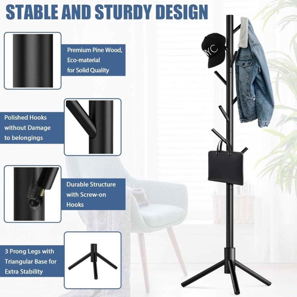 This wooden coat rack stand is perfect for keeping your coats, hats, scarves, jackets, backpacks, bags, and umbrellas organized and in one place. With its free-standing design, it can easily be placed in any room of your home and has a capacity of 8 hooks. The rack is made from beech solid wood and features a painted finish, making it a contemporary and stylish addition to your home decor. The coat rack stand is sturdy, durable, and can support a variety of items, making it a versatile addition to your home organization. It is suitable for kids, teens, adults, and babies heights because it is adjustable. The rack is 69 inches high and has a branch hook style, making it easy to hang and organize your items. On Aug 9, 2025 at 03:10:25 PDT, seller added the following information: